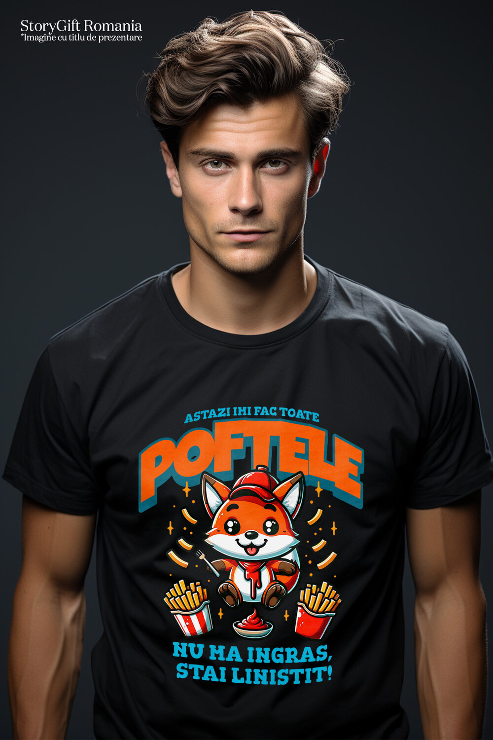 Tricou Barbati cu Vulpe Cu Sapca Rosie Cartofi Prajiti Si Sos Fast Food cu imprimeu pe Fata, 100% Bumbac, Negru, L