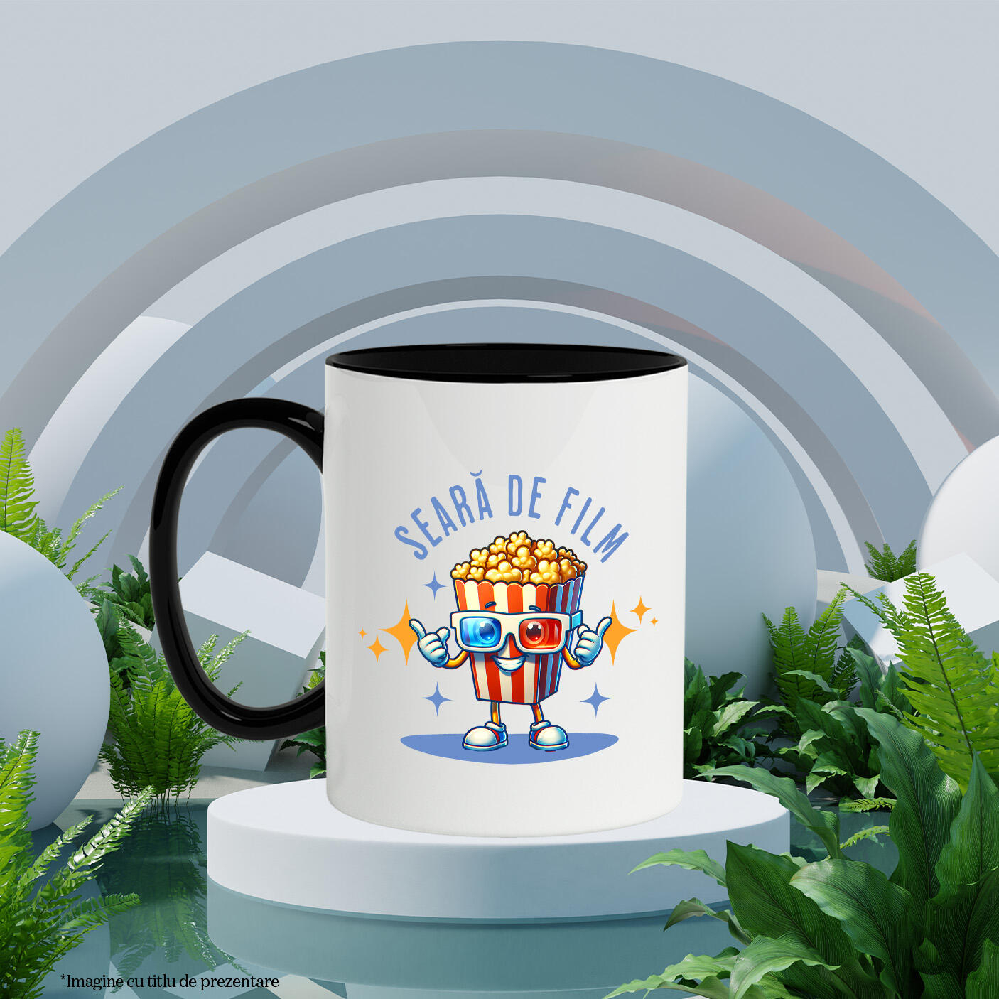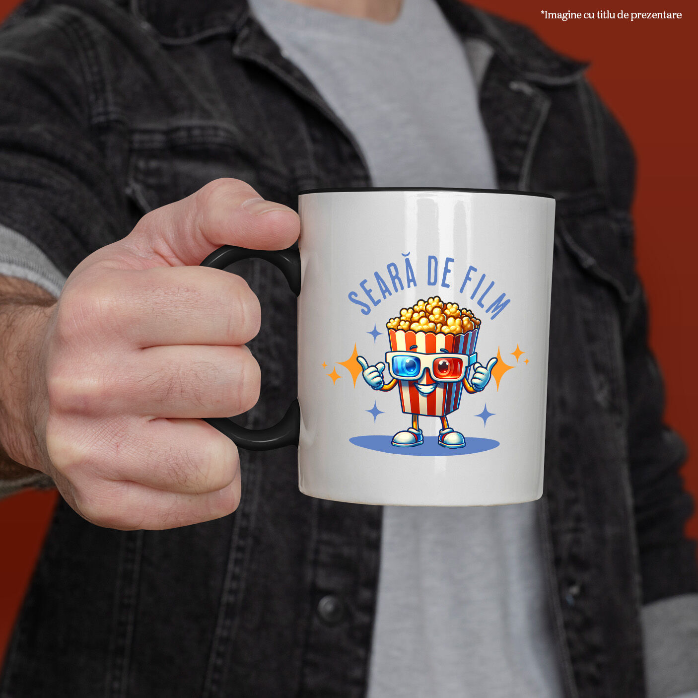 Cana Personalizata cu Cutie De Popcorn Cu Ochelari 3D Film Seara de Distractie Copii Familie, Ceramica, 330ML, cu Maner Negru