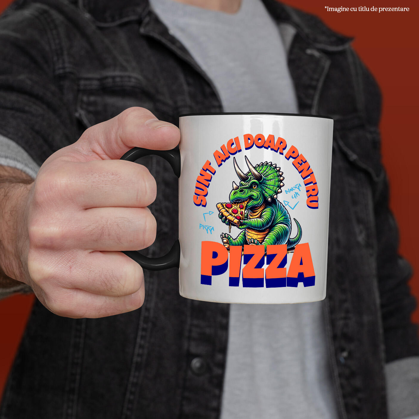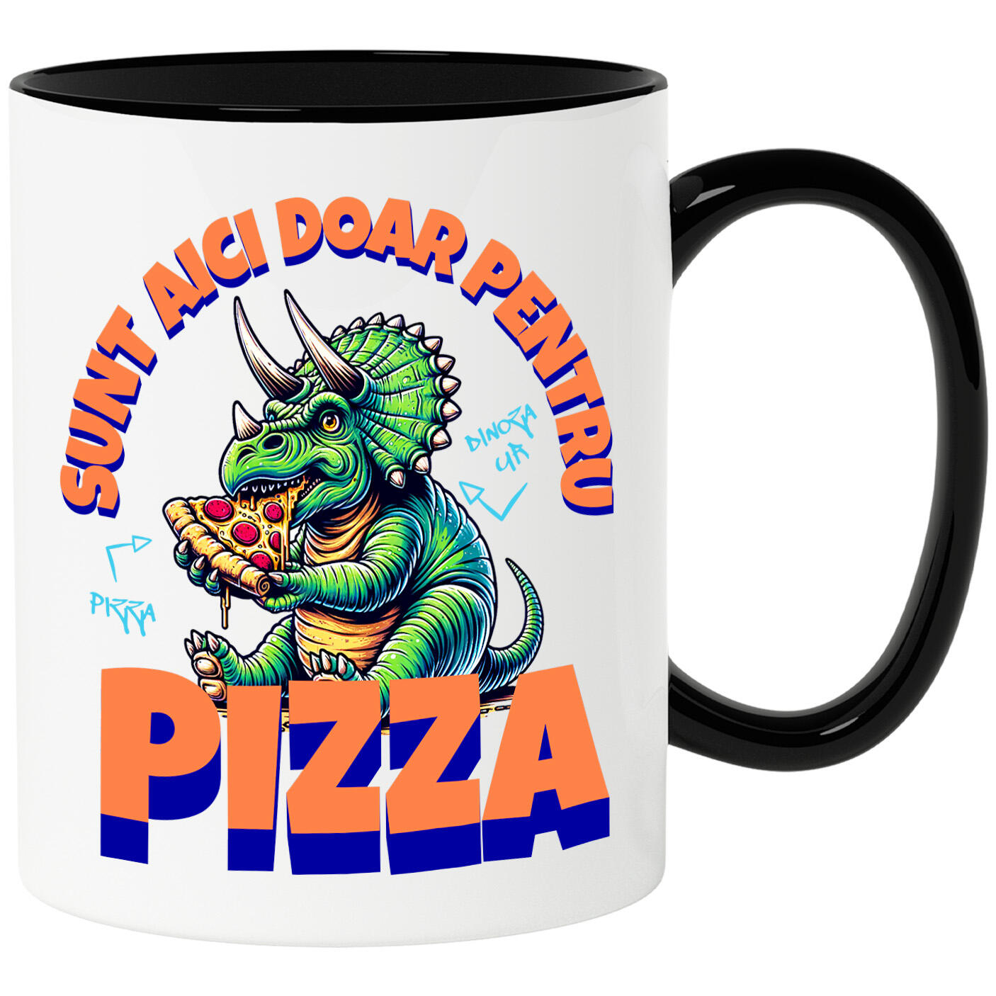 Cana Personalizata cu Dinozaur Verde Batran Cu Coarne Iubitor De Pizza Animal, Ceramica, 330ML, cu Maner Negru