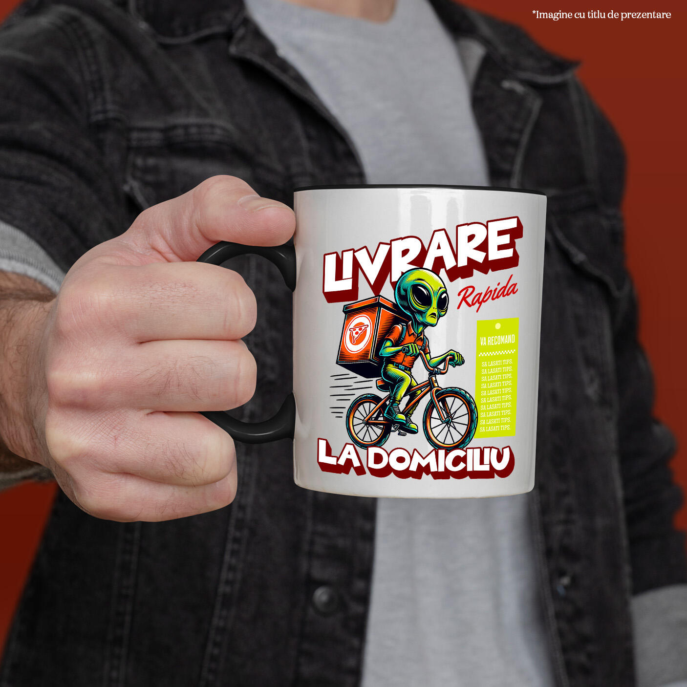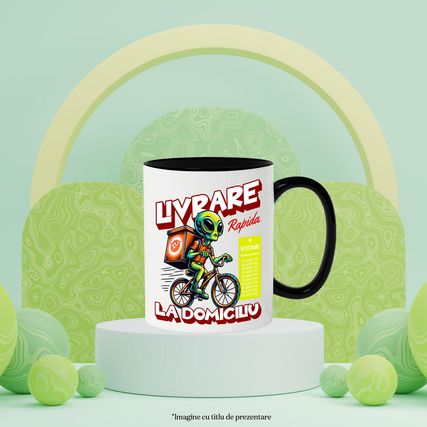 Cana Personalizata cu Extraterestru Curier Cu Bicicleta Si Cutii De Pizza Livrare la Domiciliu, Ceramica, 330ML, cu Maner Negru