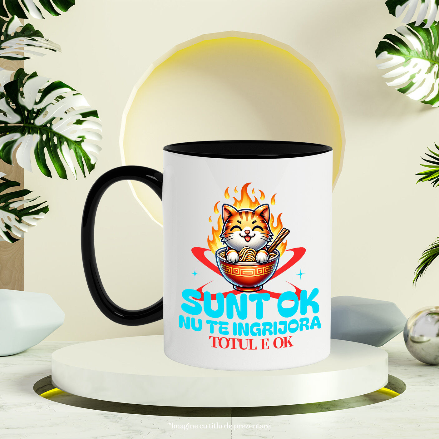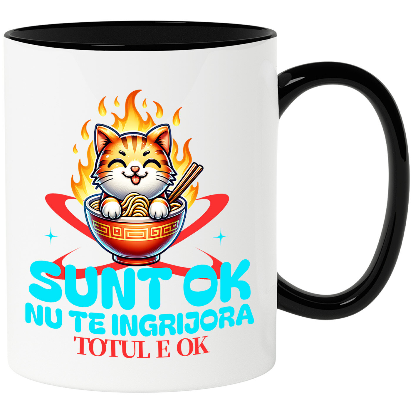 Cana Personalizata cu Pisica Portocalie In Bol Fierbinde Cu noodles In Flacari , Ceramica, 330ML, cu Maner Negru