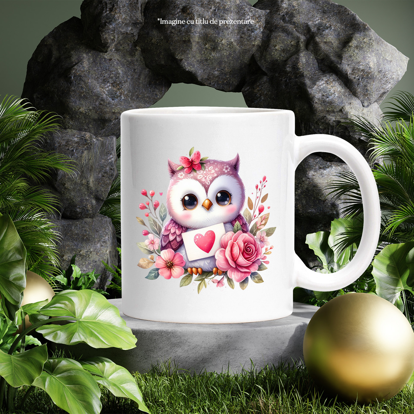 Cana cu o bufnita dragalasa, ilustratie, inima, floricele, imbujorata, emotie, iubire cu Maner Alb
