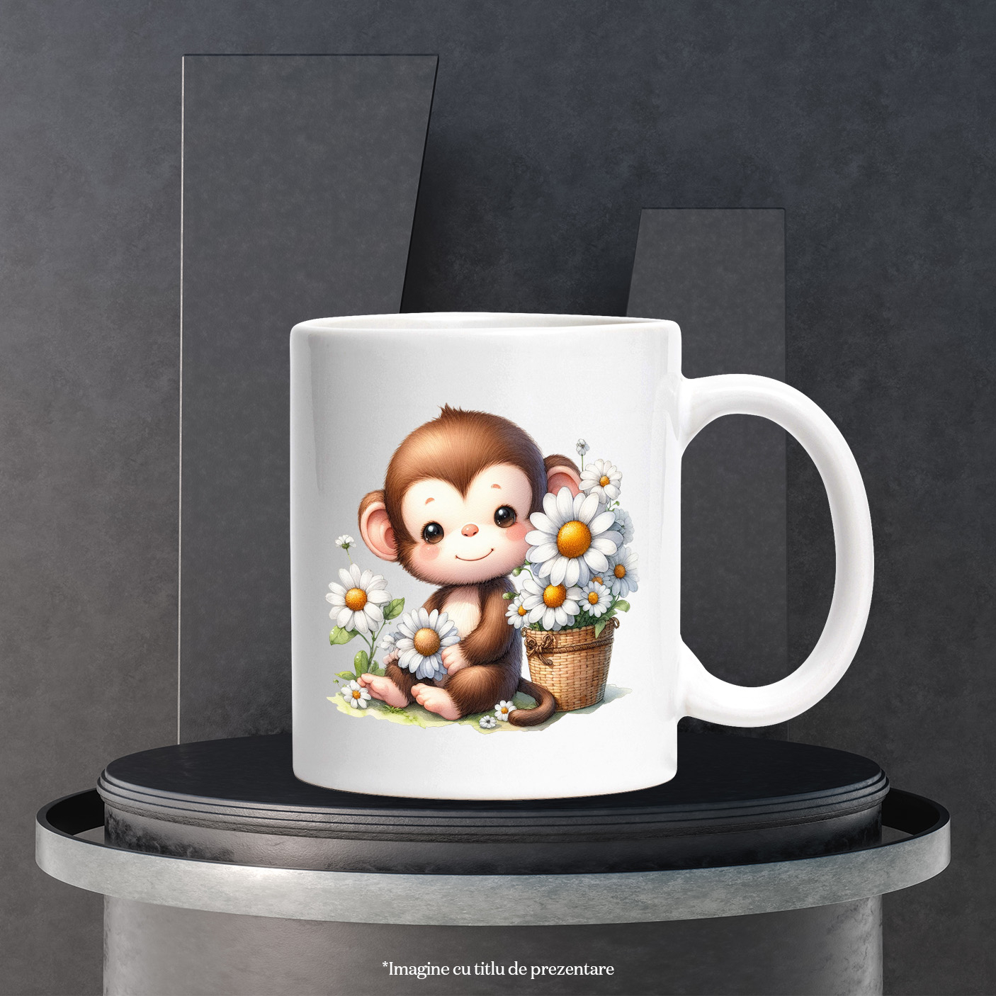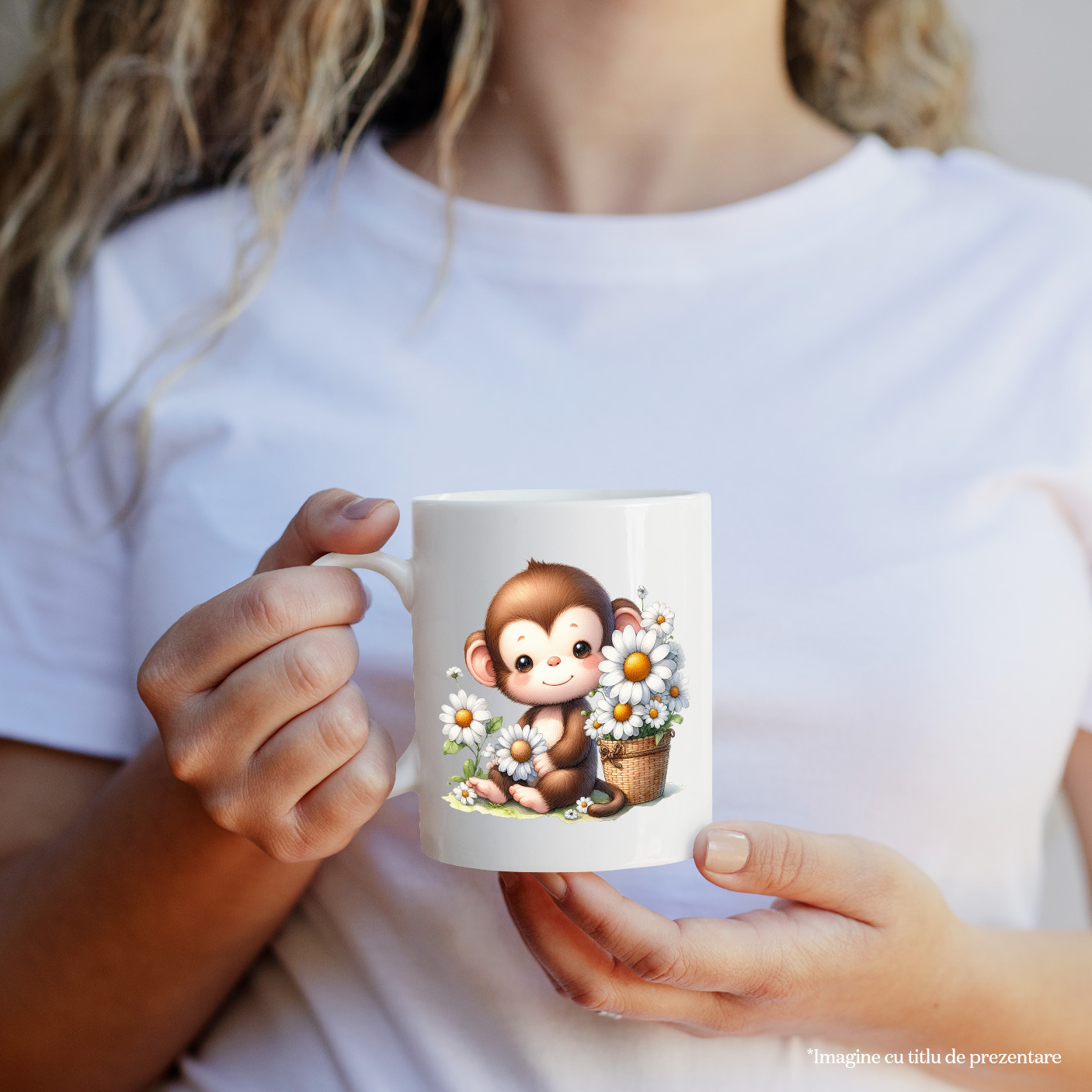 Cana cu o maimutica vesela care tine o floare, floricele albe, cosulet, imbujorata, animalut salbatic, 330ml, Ceramic cu Maner Alb