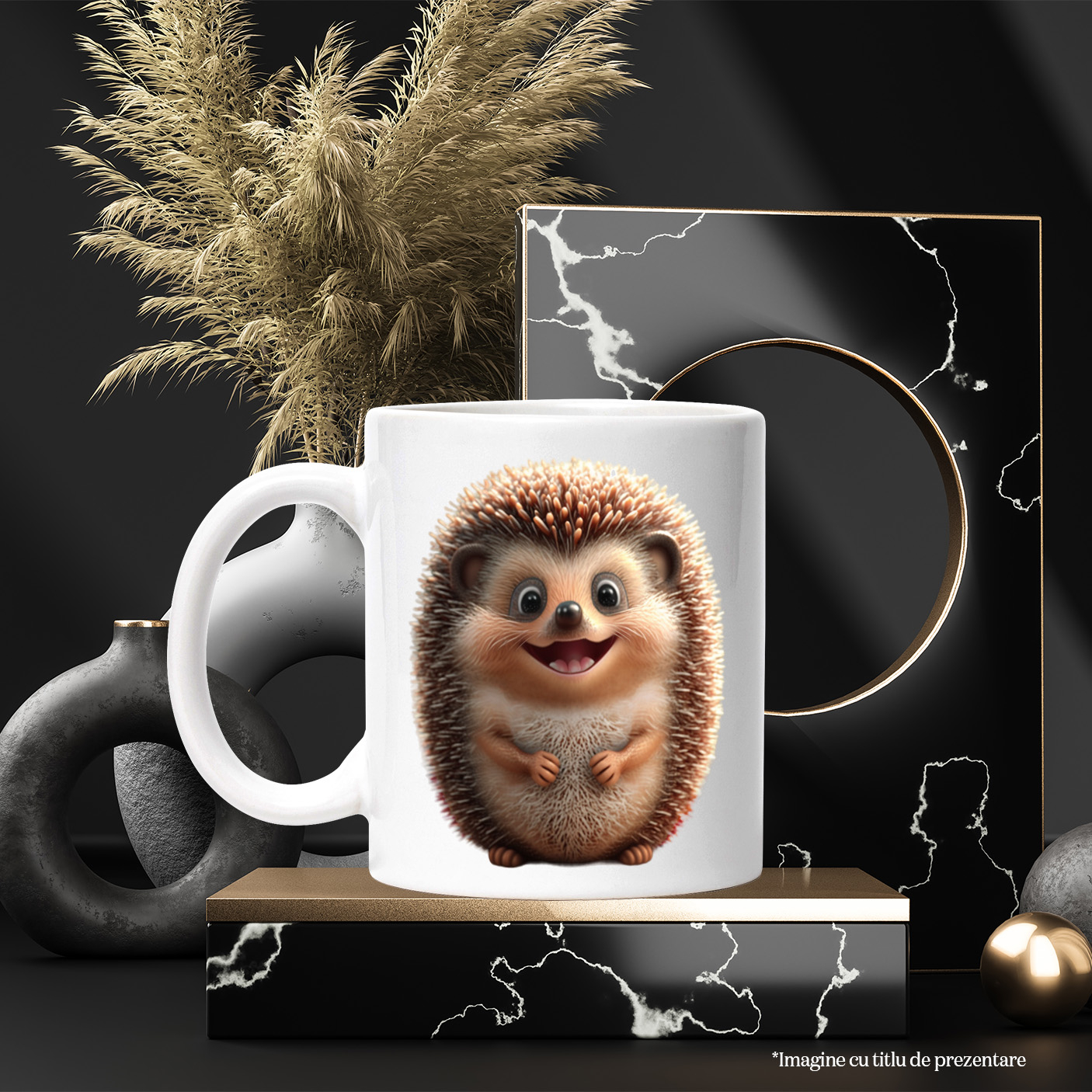 Cana cu Portret Arici Dragut, Fericit, Zambaret, Maroniu, Iubitori de Animalute,Ceramica, 330ml, cu Maner Alb