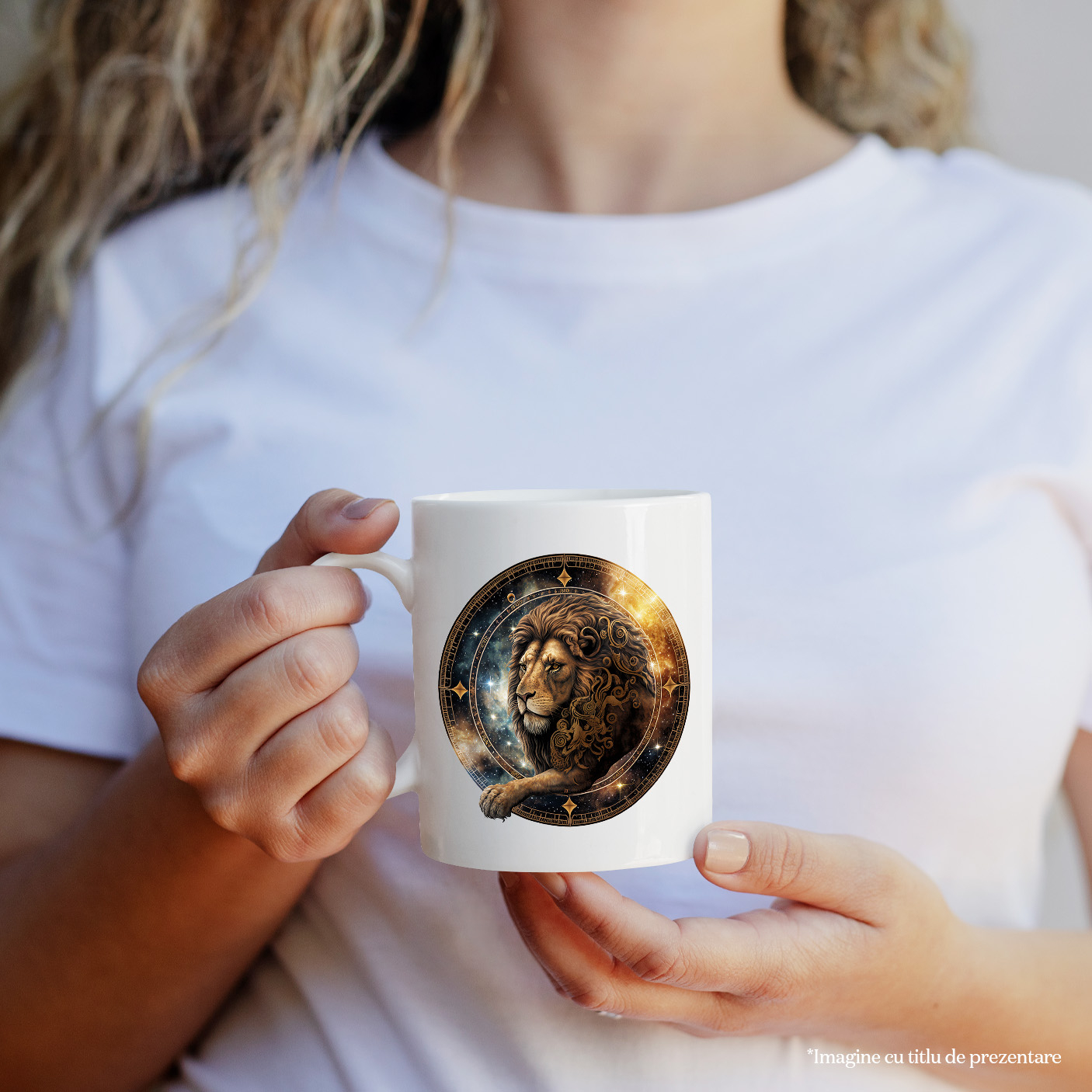 Cana cu un leu serios, ilustratie, arta abstracta, cerc, zodie, galaxie, stele, 330ml, Ceramic cu Maner Alb