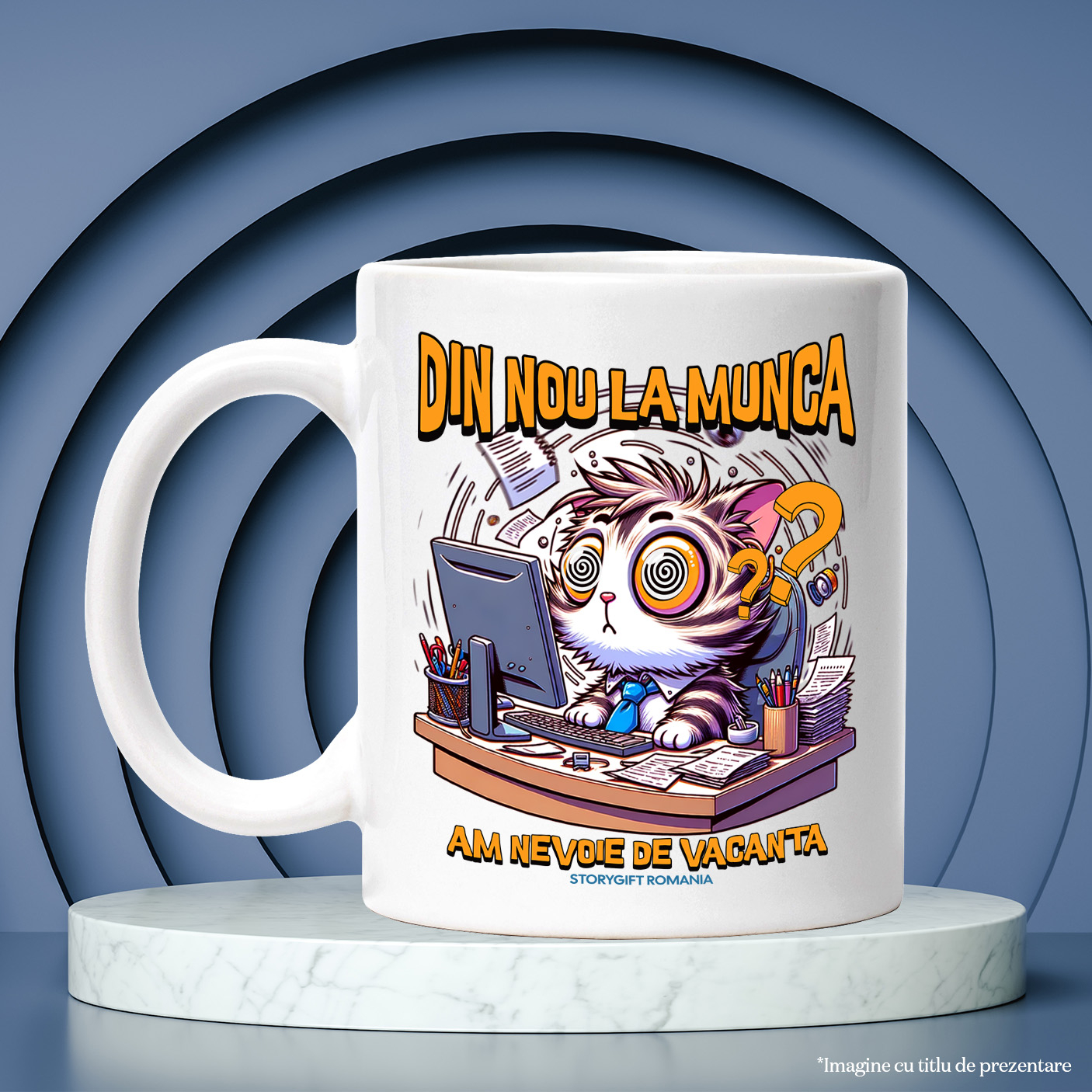 Cana din nou la munca pisica la birou work from home, 330ml, Ceramic cu Maner Alb