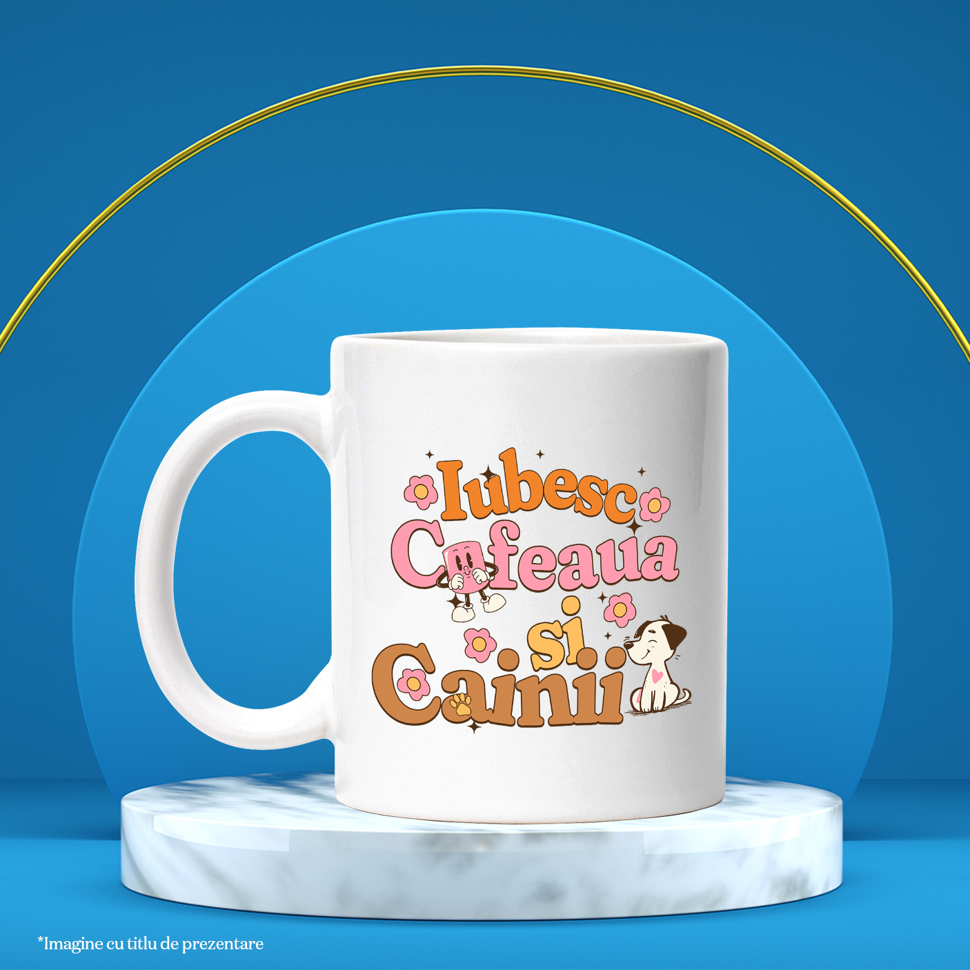 Cana Iubesc cafeaua si caini animale mama, 330ml, Ceramic cu Maner Alb