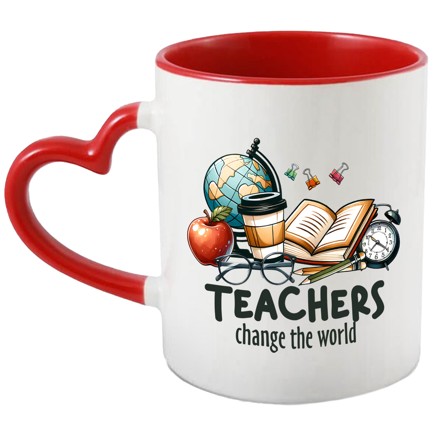 Cana cu mesajul ""Teachers change the world"", invatatorii schimba lumea, ilustratie, scoala, elevi, studenti, profesori, educatie, invatatura, carte cu Maner Inima Rosie