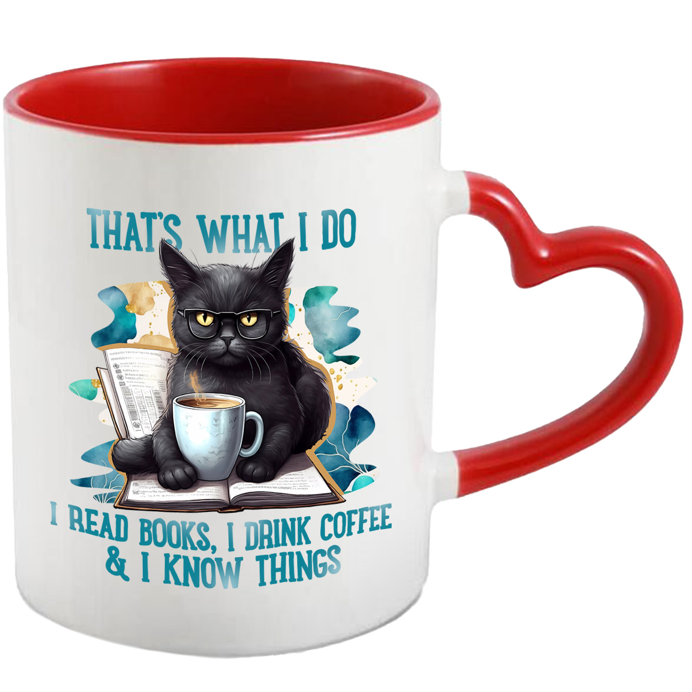 Cana cu o pisica neagra cu mesajul ""That's what I do: I read books, I drink coffee & I know things"", carte, ilustratie, literatura, citi, stie, bea cafea cu Maner Inima Rosie
