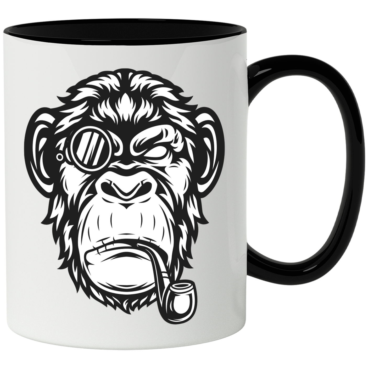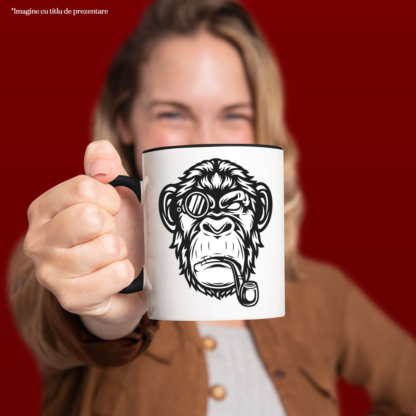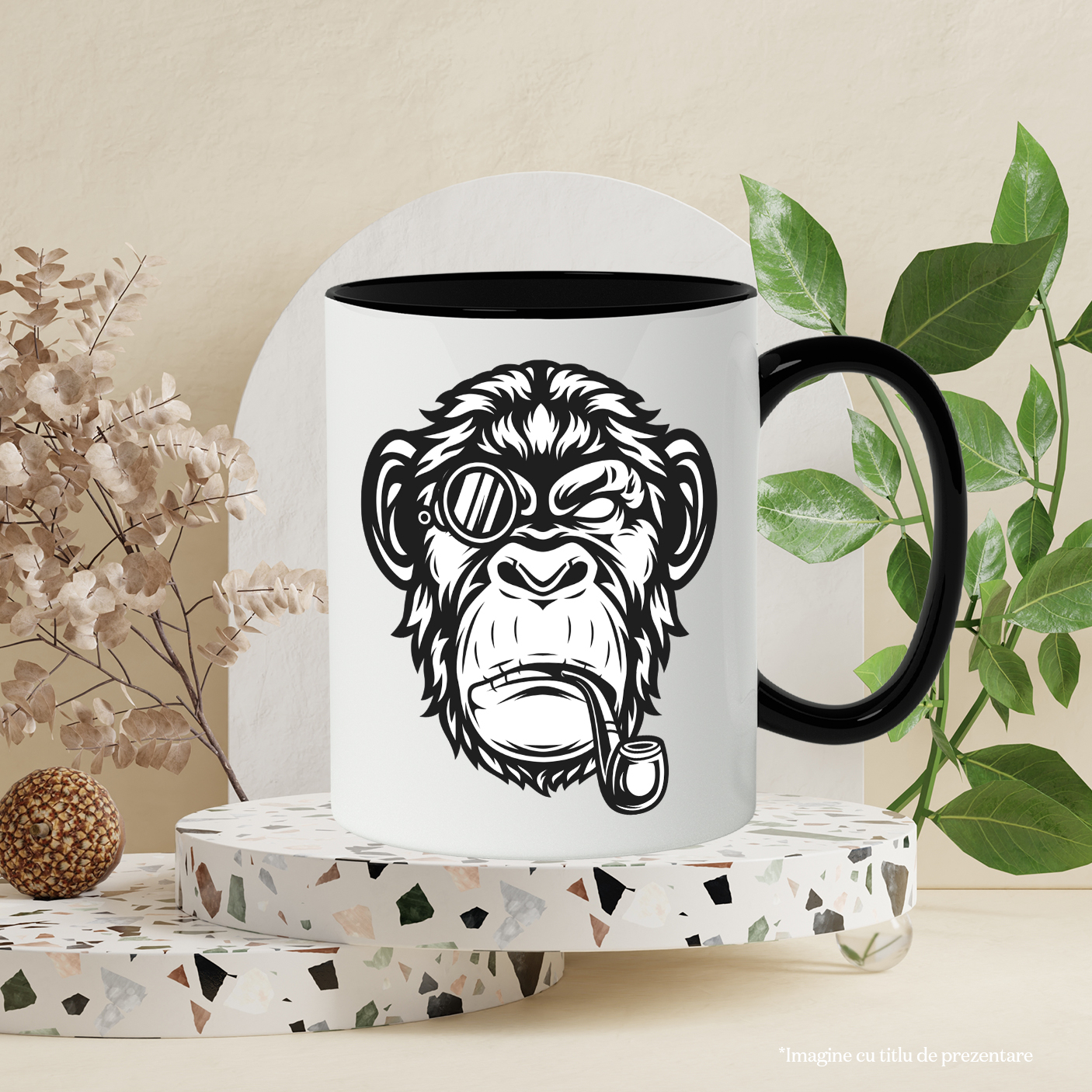 Cana Cu Maimuta, Pipa, Tutun, Monoclu, Portret, Alb Negru 330 ml, Ceramica cu Maner Negru