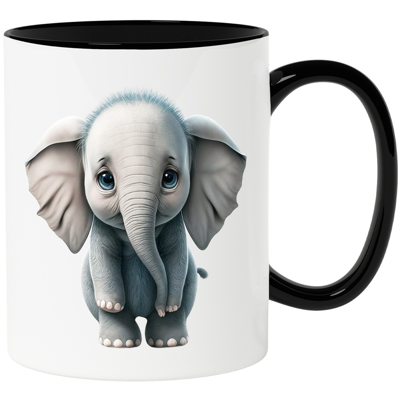 Cana cu Portret Elefant Realist, Dragut, Micut, Gri, Trompe de Elefanti, Ochii Albastri, Elefant, Iubitori de Animale,Ceramica, 330ml, cu Maner Negru