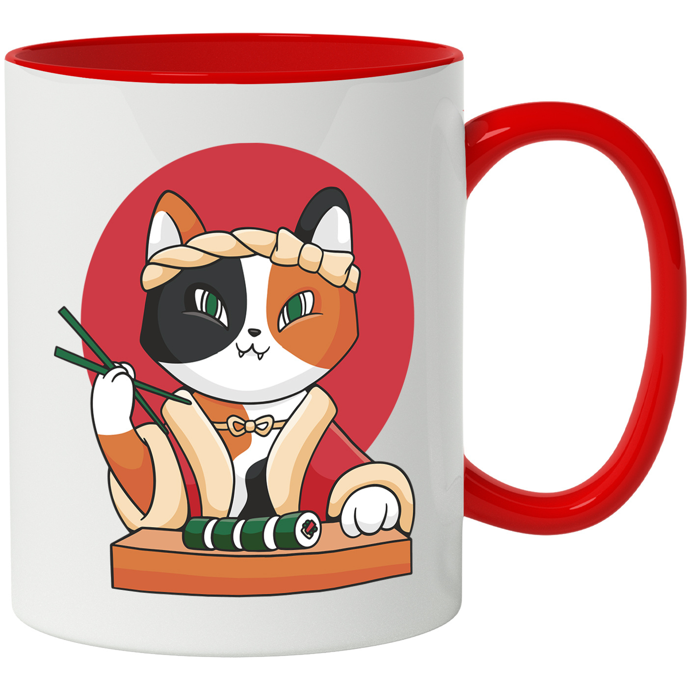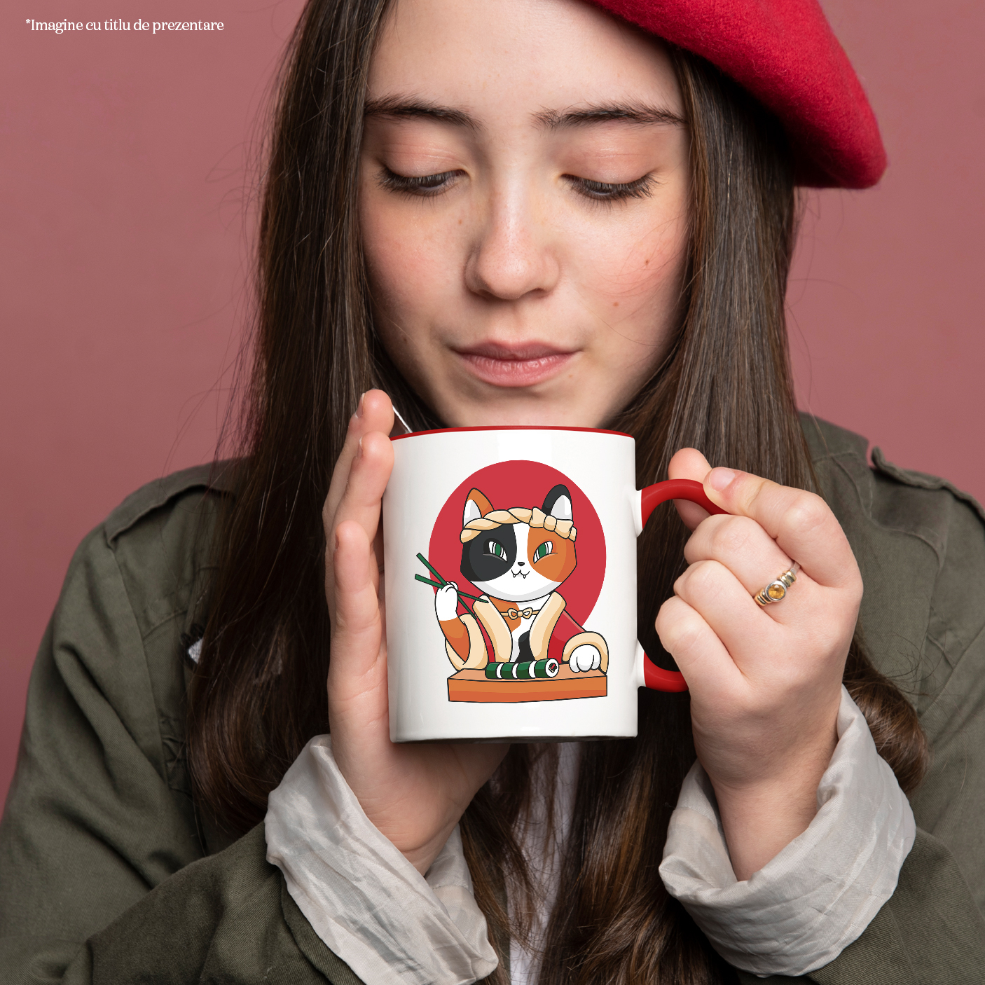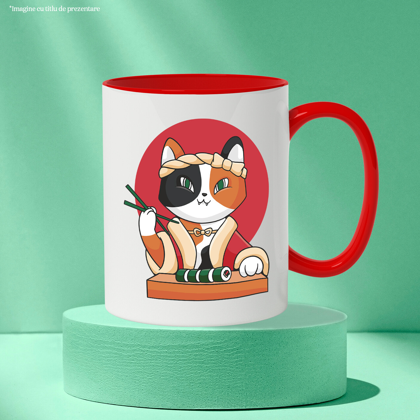 Cana Cu Pisica In Costum Traditional Asiatic Mancand Sushi, Animale Blanoase, Iubitorii De Peste, 330 ml, Maner Negru cu maner Rosu
