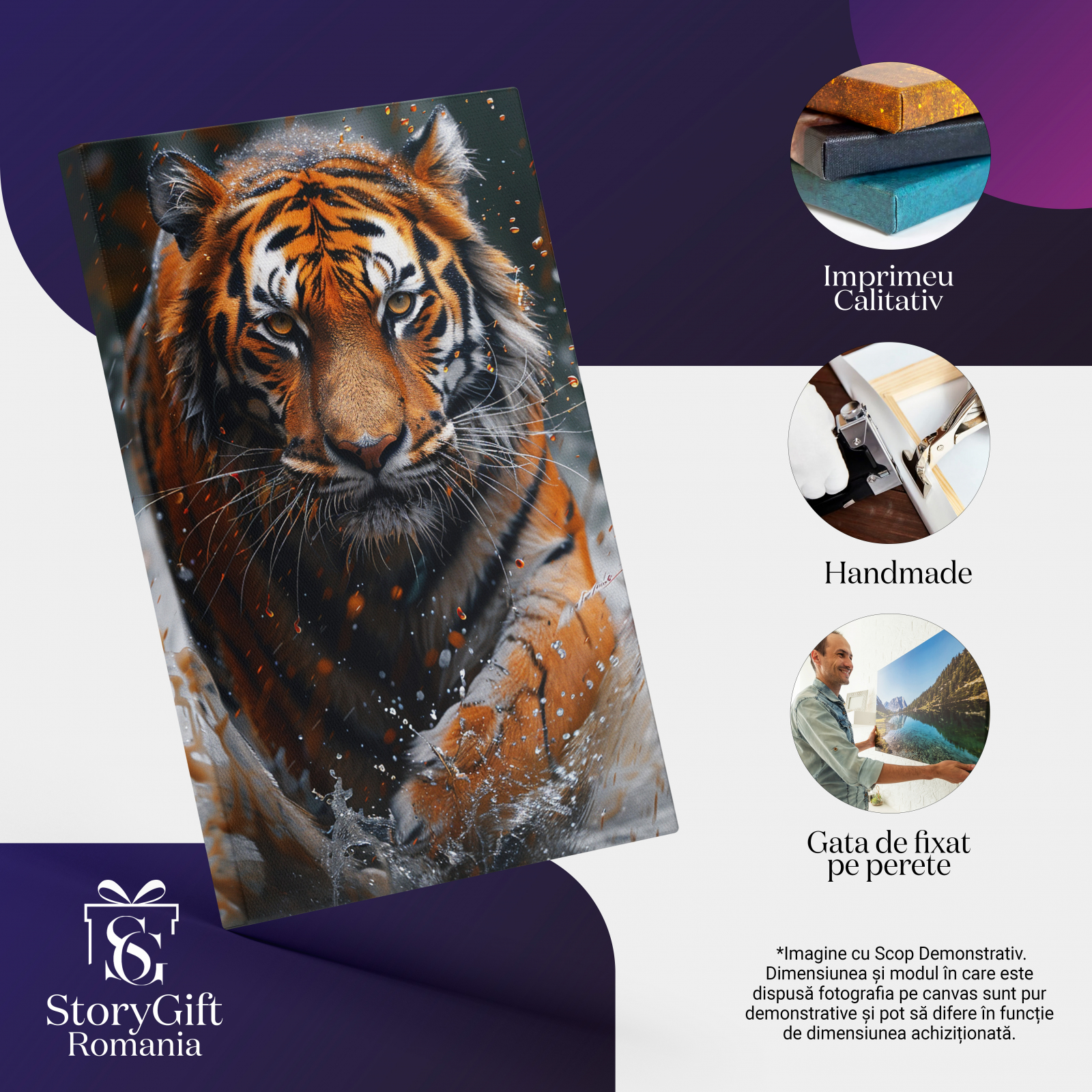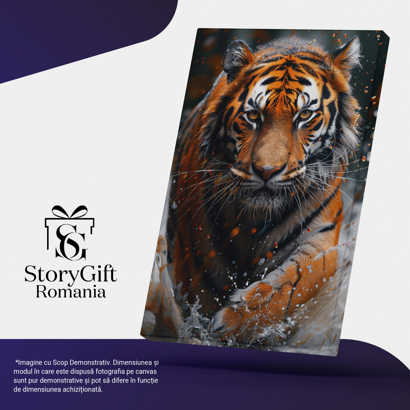 Tablou Canvas: Tigru înspăimântătot ieșit la vânătoare printre valuri de apă -În ochii unui prădător Pictura Digitala 100x70CM - Tablou Canvas Signature de la StoryGift Romania