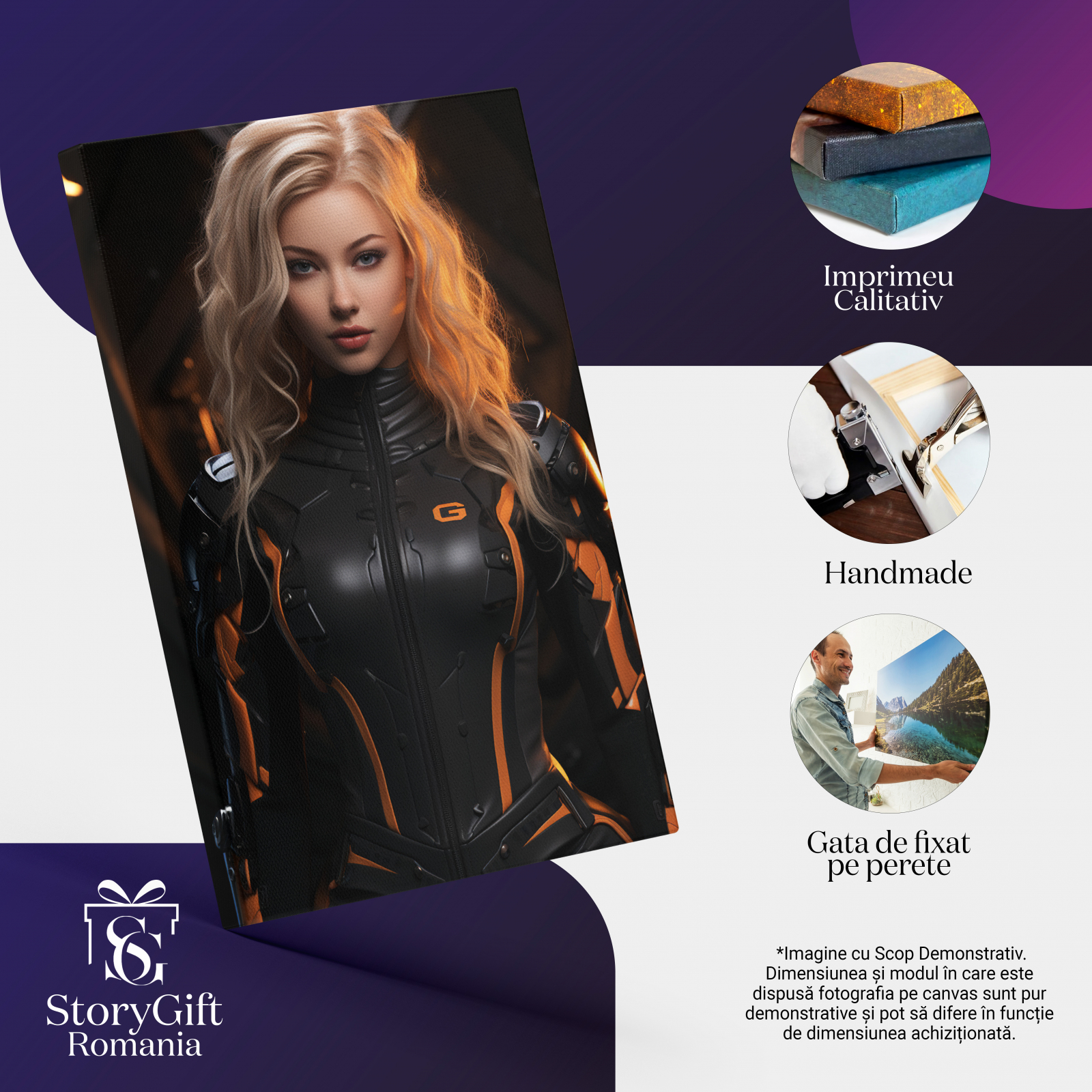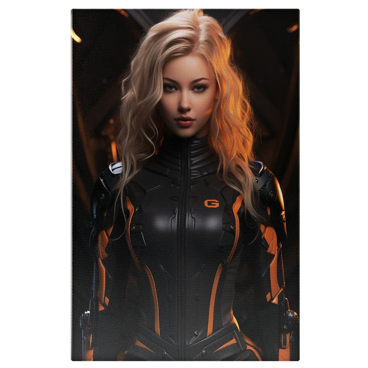 Tablou Canvas: Femeie spion Frumusete, Blond, intuneric, Moda, Design vestimentar, Fotomodel, Caracter fictional, Pictura Digitala 40x25CM - Tablou Canvas Signature de la StoryGift Romania