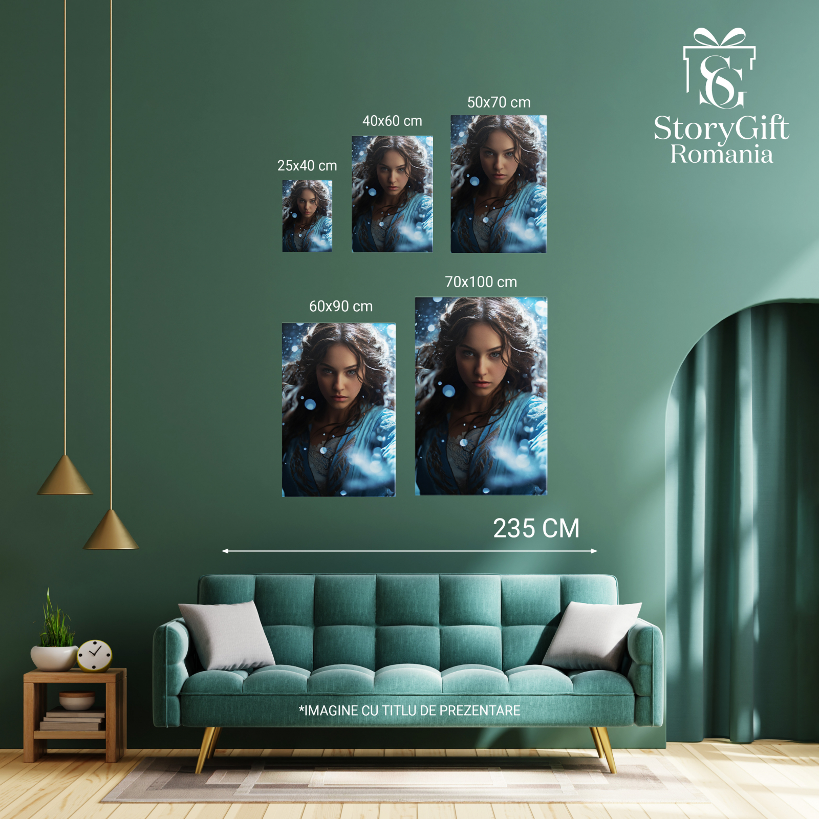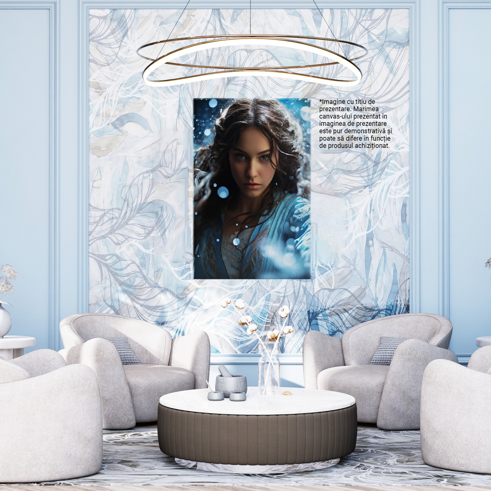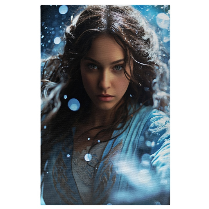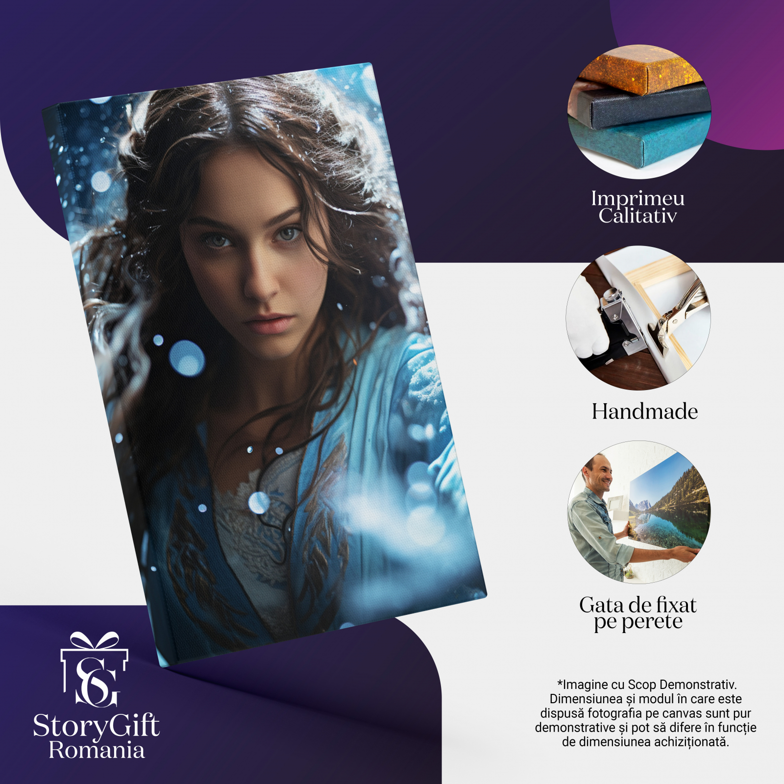 Tablou Canvas: Regina Iernii Figura Feminina printre Fulgi de Zapada in Rochie Albastra si Privire Inghetata Pictura Digitala 40x25CM - Tablou Canvas Signature de la StoryGift Romania