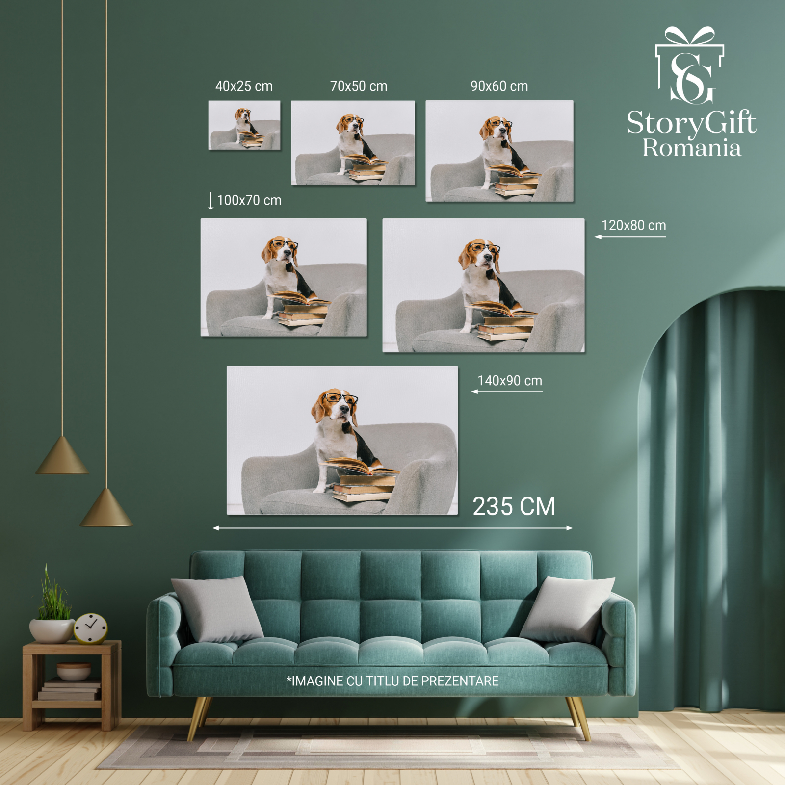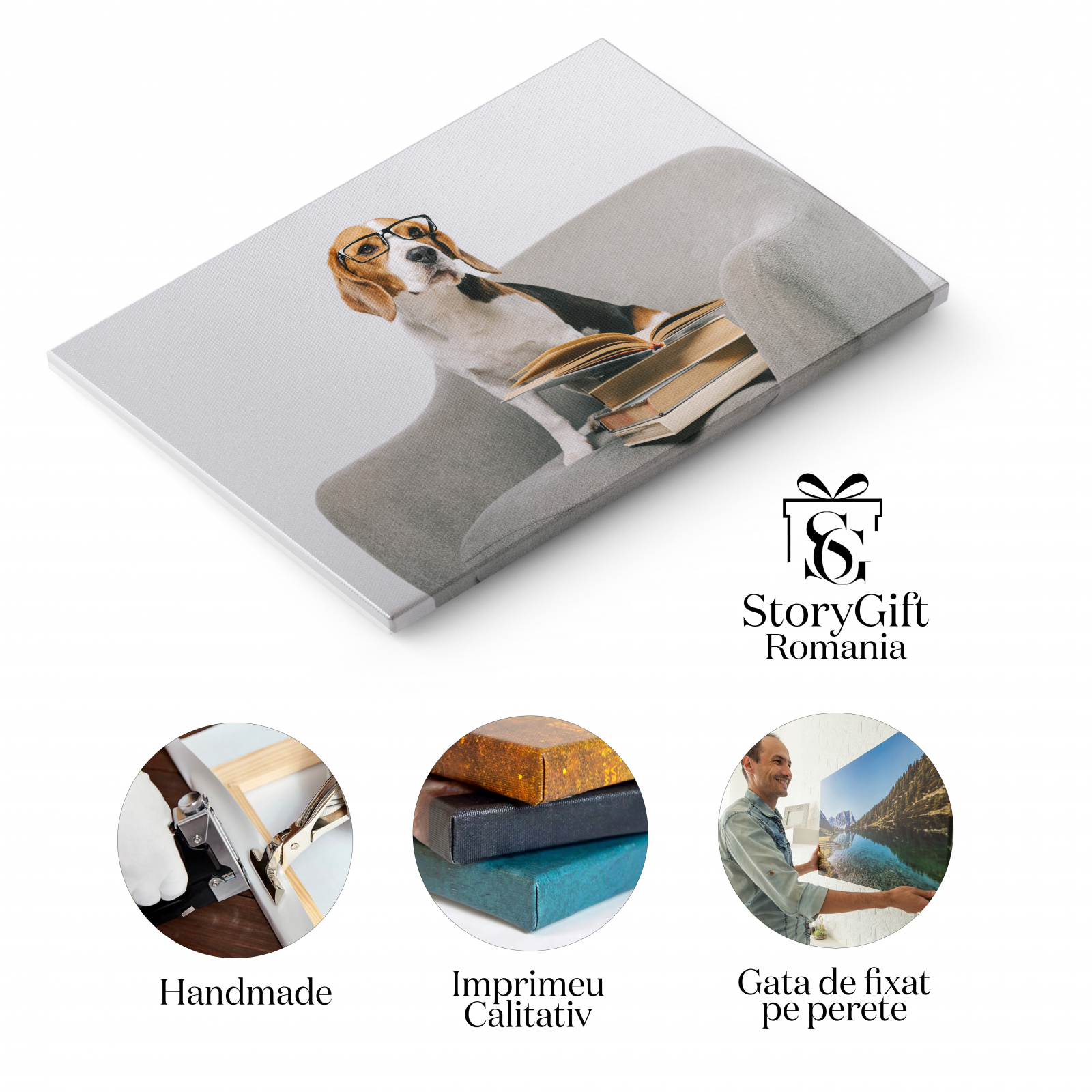 Tablou Canvas Beagle Dragut in Fotoliu cu Carti pe Fundal Gri animal, fotoliu, beagle, carti, dragoste, educare 70x50CM - Tablou Canvas Signature de la StoryGift Romania