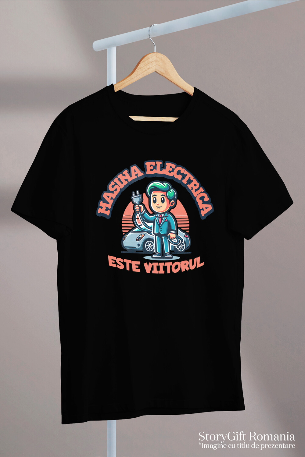 Tricou Barbati cu Barbat Animatie Incarcator Masina Electrica Este Viitorul cu imprimeu pe Fata, 100% Bumbac, Negru, L