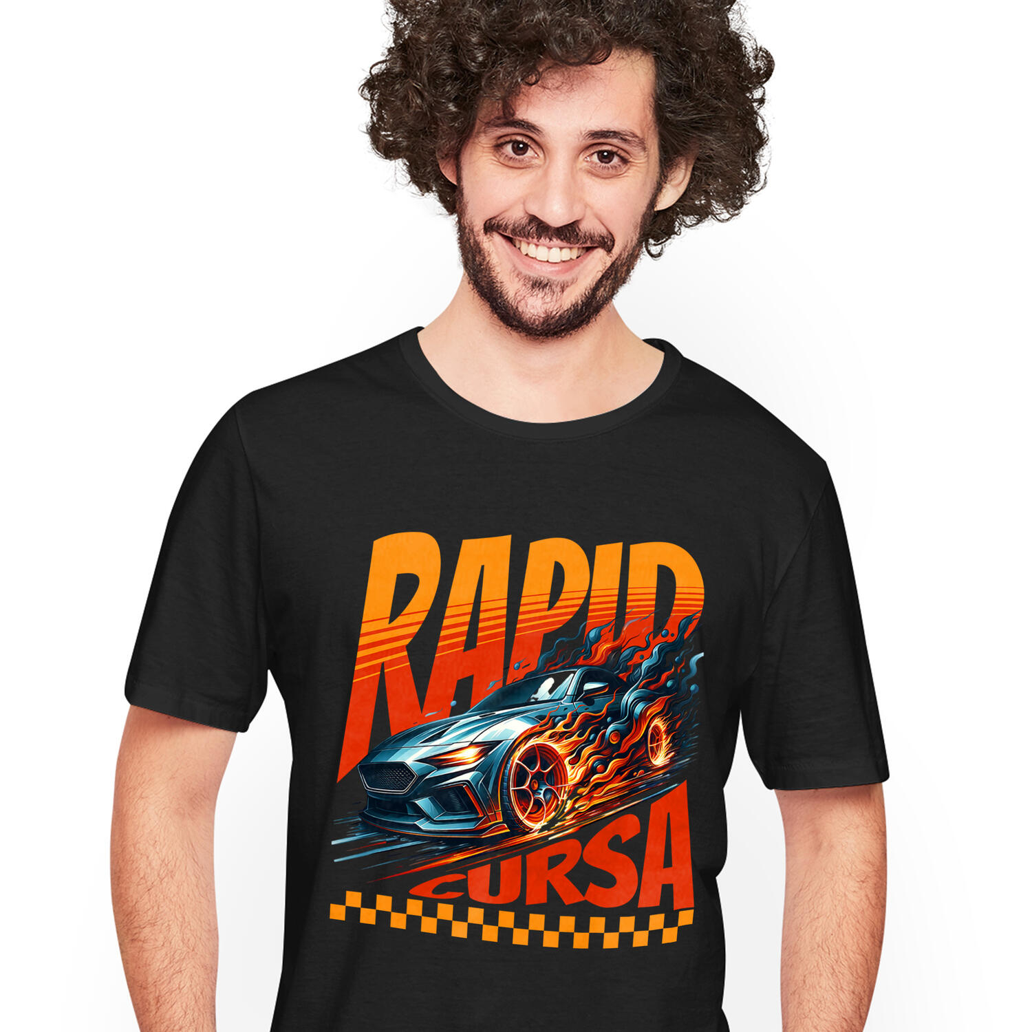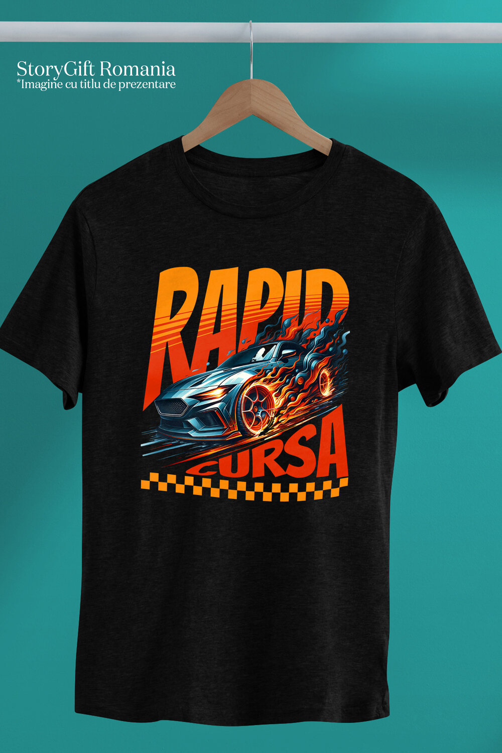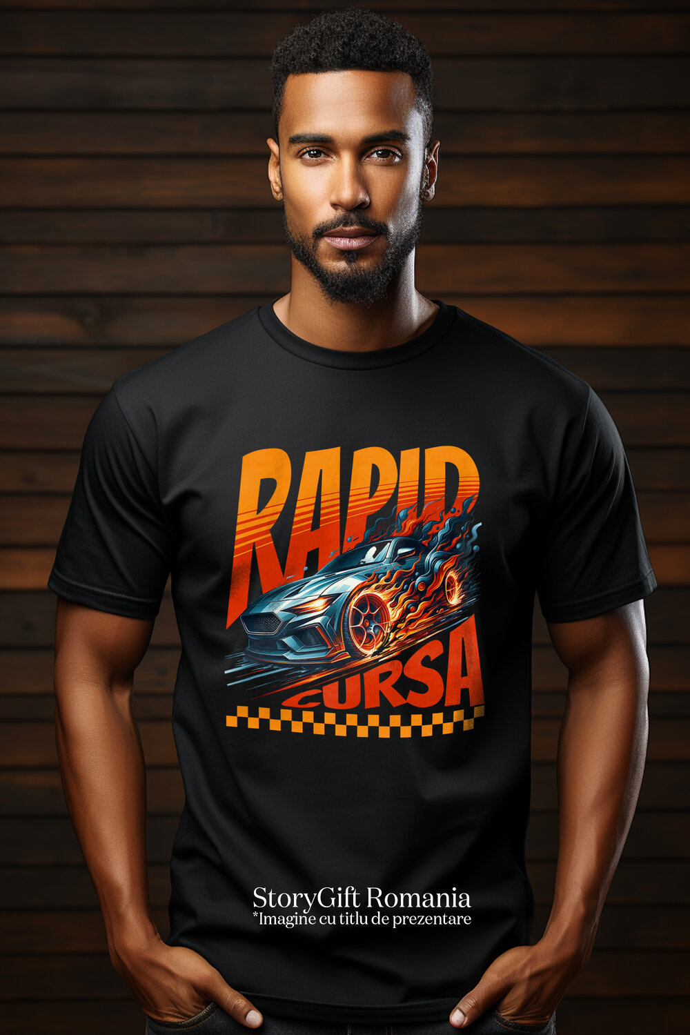 Tricou Barbati cu Masina Neagra Sport In Flacari Iubitorii De Viteza Rapid Cursa. Ilegal, cu imprimeu pe Fata, 100% Bumbac, Negru, L