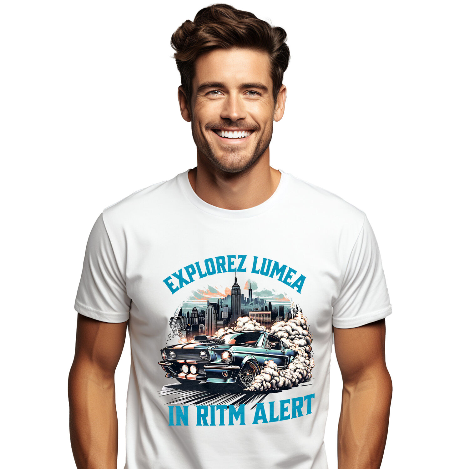Tricou Barbati cu Masina Viteza Tunata Vintige Albastra Oras Cu Cladiri Inalte cu imprimeu pe Fata, 100% Bumbac, Alb, M