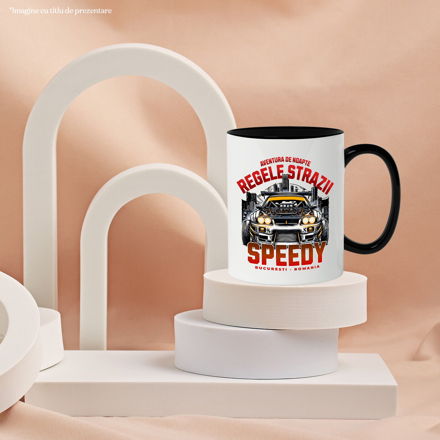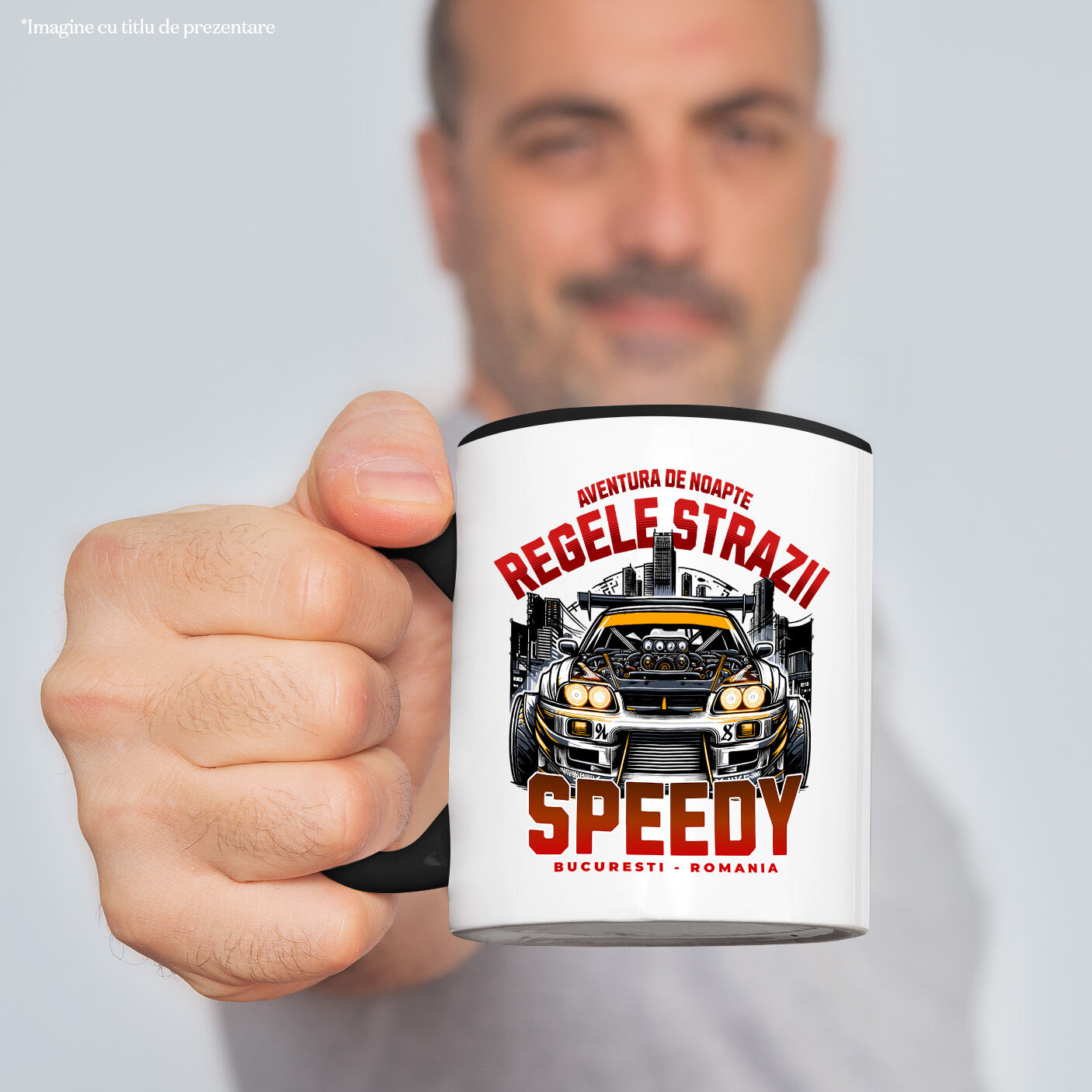 Cana Personalizata cu Masina Fara Capota De Curse Text Regele Curse Ilegale Barbati, Ceramica, 330ML, cu Maner Negru
