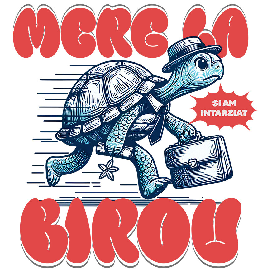 Sticker Personalizat cu Broasca Testoasa Cu Palarie Si Cravata Alergand Servieta Birou Intarziat cu Margini Albe, PVC Vinyl 10 cm