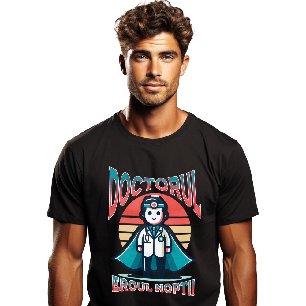 Tricou Barbati cu Barbat Cu Pelerina Super Erou Doctor Sanatate Meserie Pasiune cu imprimeu pe Fata, 100% Bumbac, Negru, L