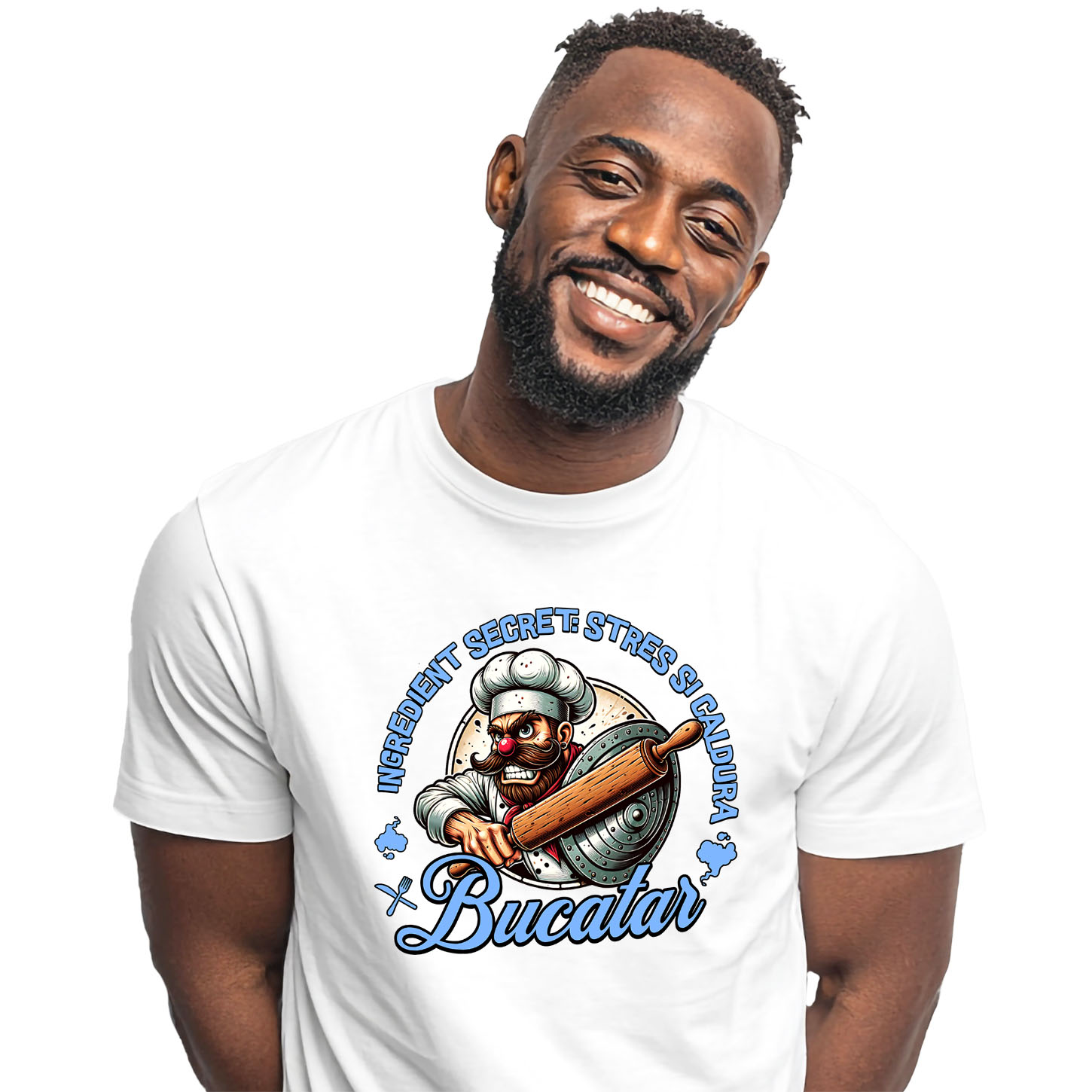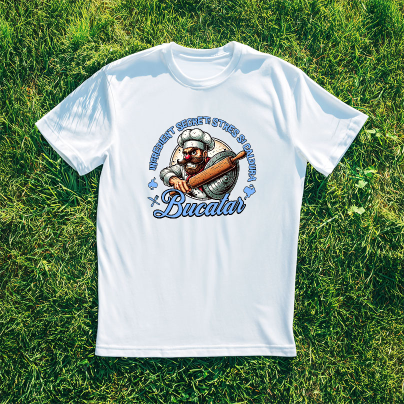 Tricou Barbati cu Bucatar Cheff Cu Palarie Inalta Si Mustata Meserie Mancare Pasiune cu imprimeu pe Fata, 100% Bumbac, Alb, M