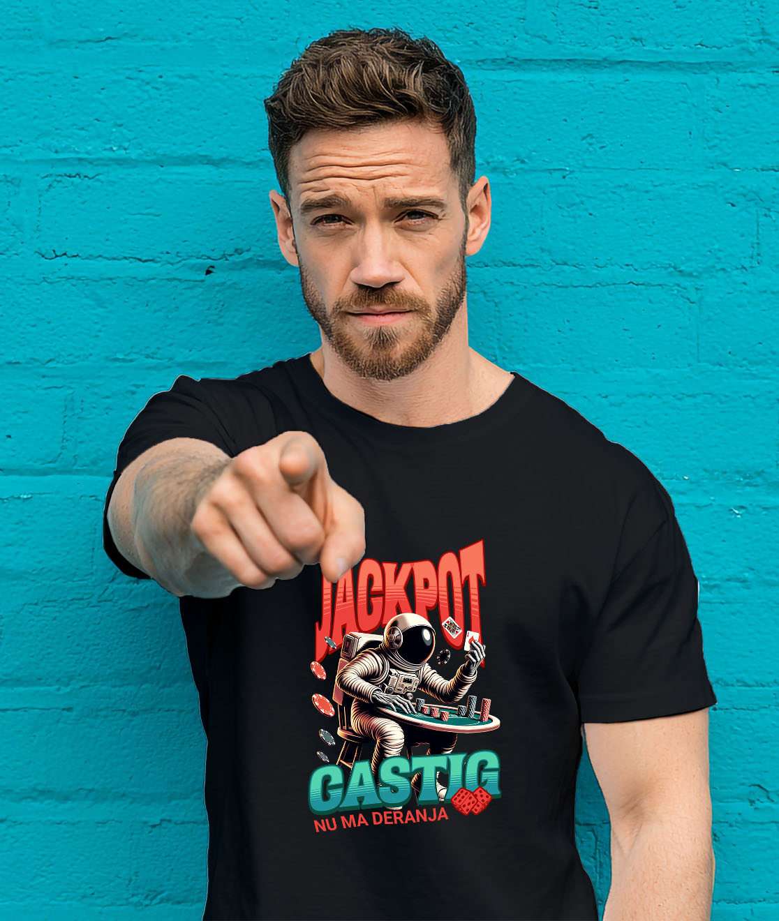 Tricou Barbati cu Costum Spatial Astronaut Jucand Poker Zaruri Castig joc De Noroc cu imprimeu pe Fata, 100% Bumbac, Negru, L