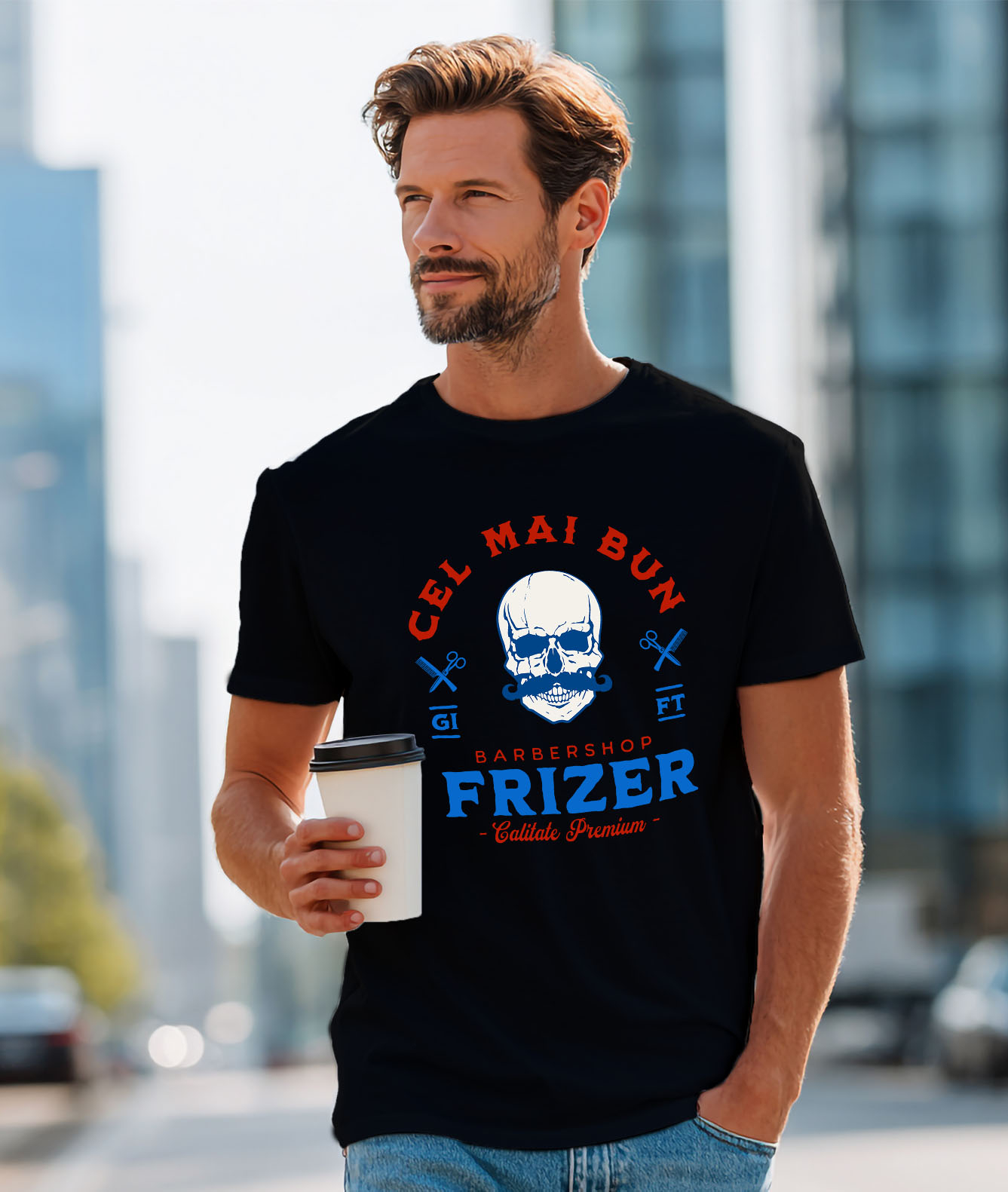Tricou Barbati cu Craniu Uman cu Mustata Intrumente Frizerie Barber Shop Meserie Pasiune cu imprimeu pe Fata, 100% Bumbac, Negru, L