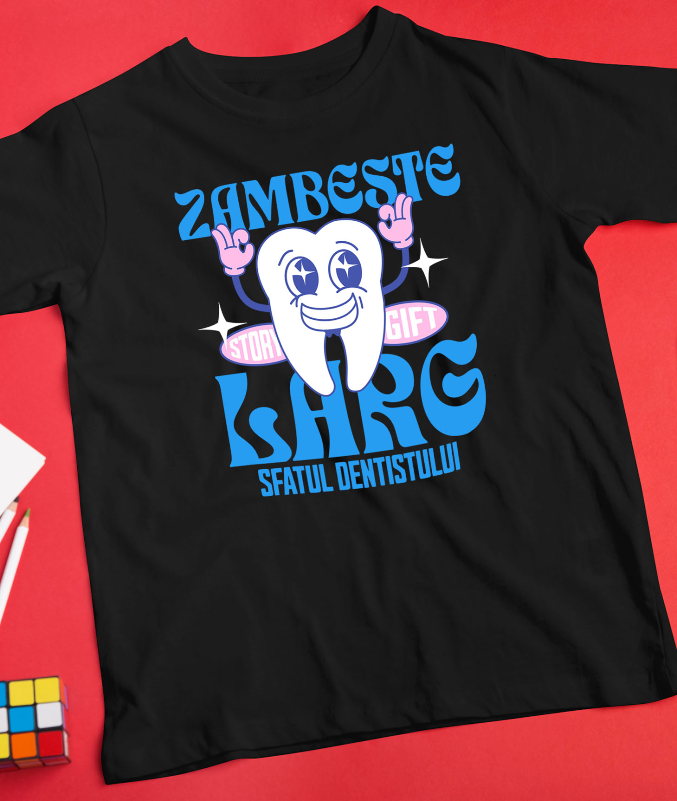 Tricou Femei cu Dinte Vesel Aratand Semn Ok Dentist Meserie Dantura Zambeste Larg cu imprimeu pe Fata, 100% Bumbac, Negru, L