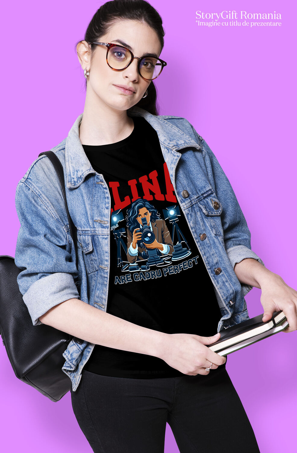 Tricou Femei cu Femeie Bruneta cU Aparat Foto Televiziune Meserie Pasiune cu imprimeu pe Fata, 100% Bumbac, Negru, L