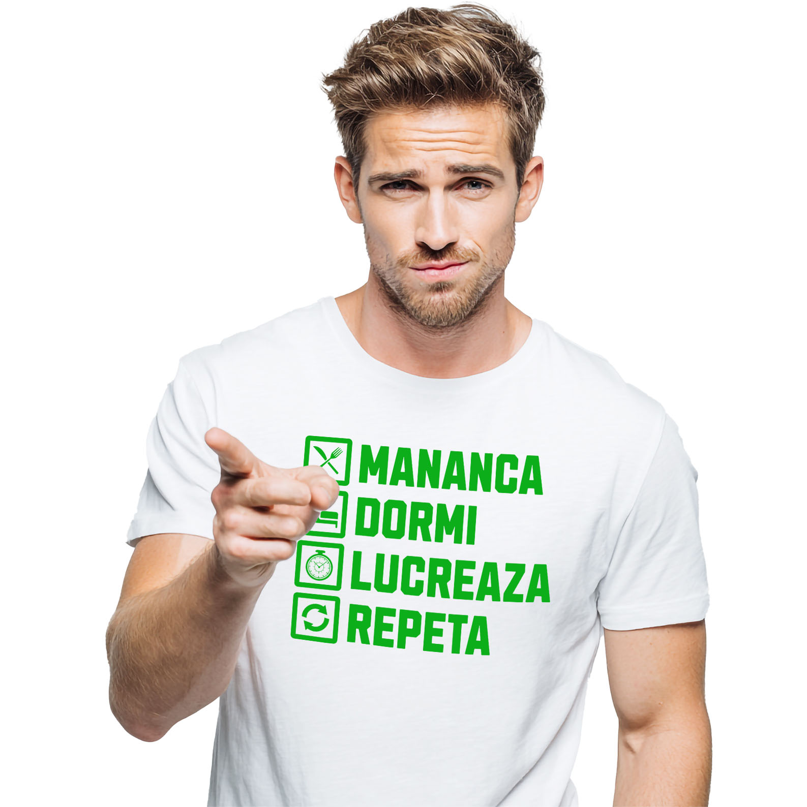Tricou Barbati cu Rutina Zilnica pentru Iubitorii DE Munca Haios Mananca Dormi Lucreaza Repeta cu imprimeu pe Fata, 100% Bumbac, Alb, L