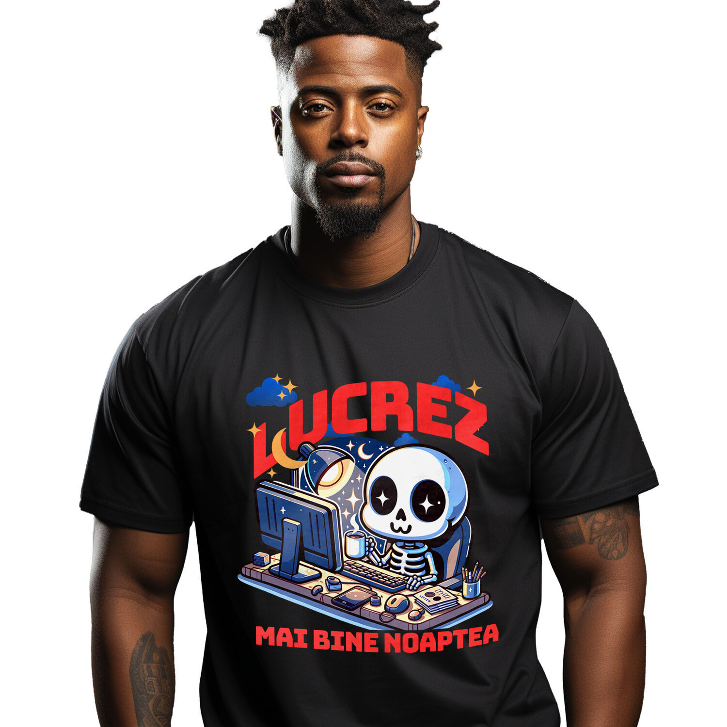 Tricou Barbati cu Schelete Uman Cu Cana cafea In Fata calculator Lucrez Noaptea cu imprimeu pe Fata, 100% Bumbac, Negru, L