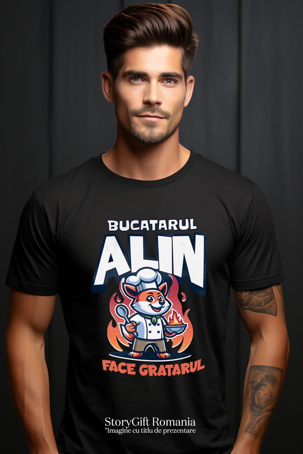 Tricou Barbati cu Vulpe In Halat Si palarie Inalta Unealta bucatarie Foc Text Bucatarul Alin Face Gratarul cu imprimeu pe Fata, 100% Bumbac, Negru, S