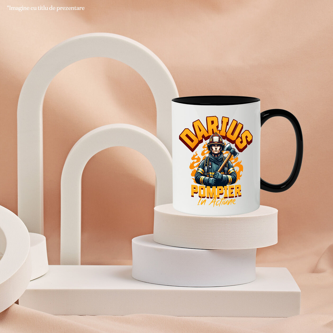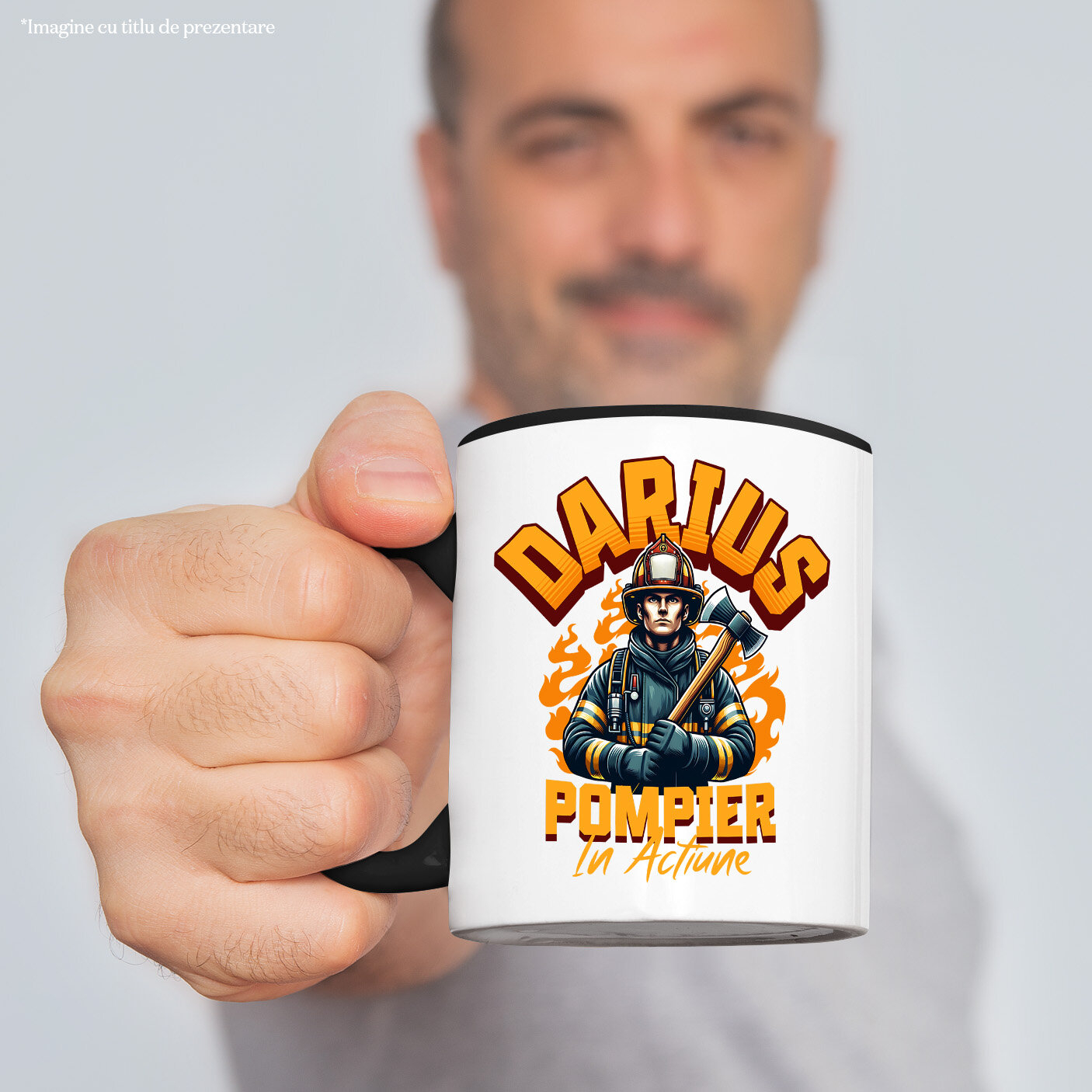 Cana Personalizata cu Barbat In Costum Pompier Cu Topor In Flacari Aparare Siguranta, Ceramica, 330ML, cu Maner Negru