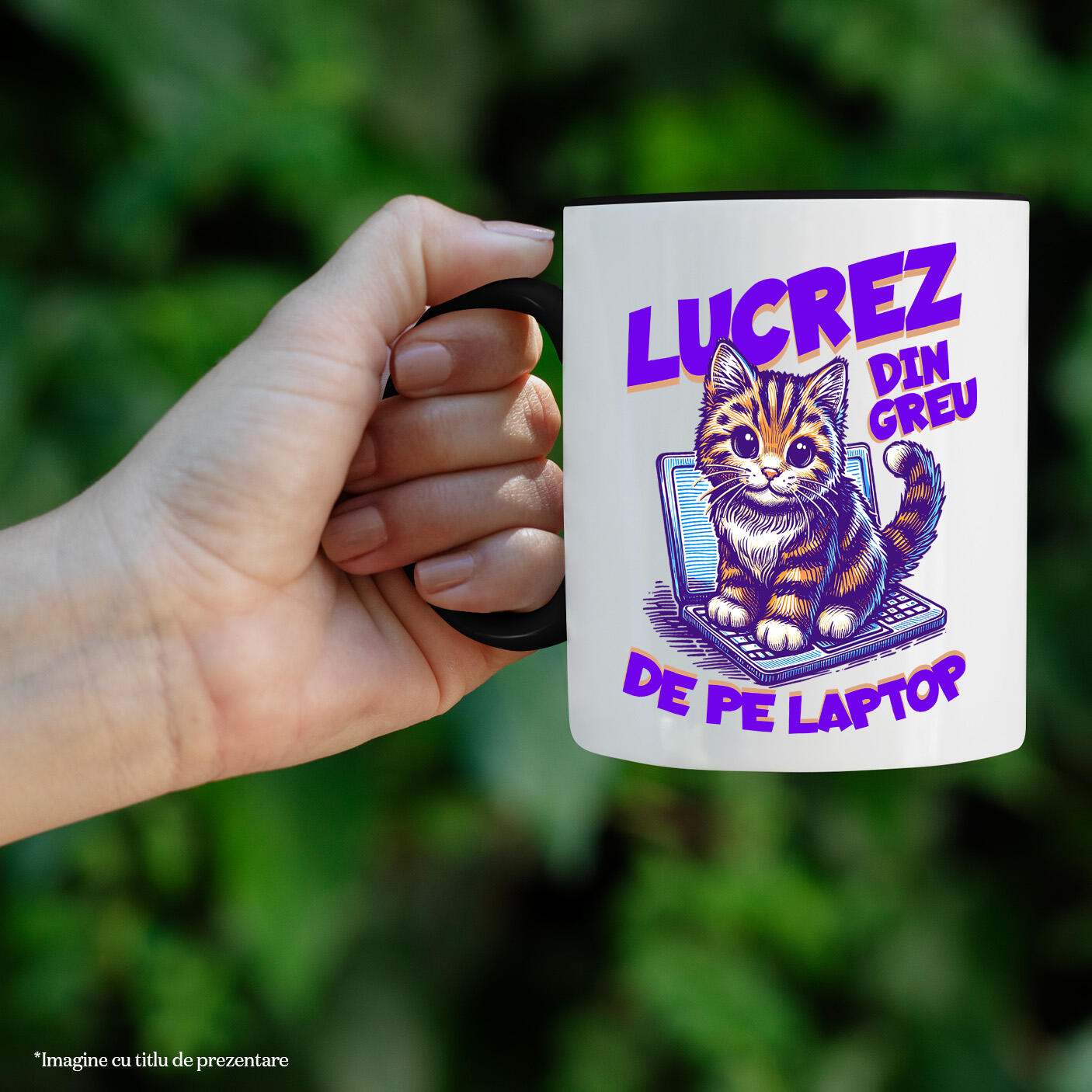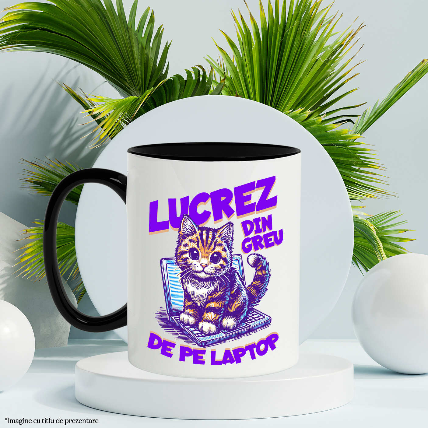 Cana Personalizata cu Pisica Vesela Pui Pe Laptop Animal blanos Work From Home, Ceramica, 330ML, cu Maner Negru