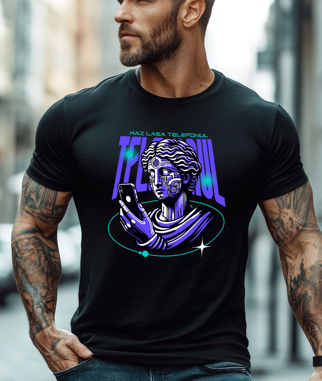 Tricou Barbati cu Chip Uman Statuie Greceasca Telefon Robot Copii Digitalizare cu imprimeu pe Fata, 100% Bumbac, Negru, L
