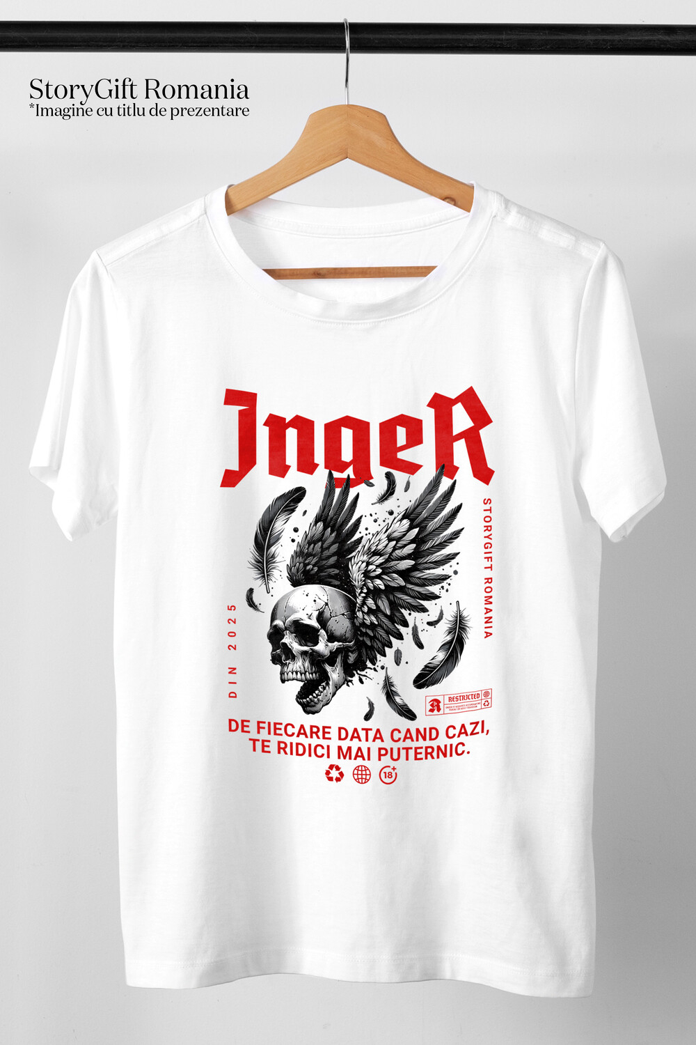 Tricou Barbati cu Craniu Uman Aripi Negre Inger Motivational Avere Putere cu imprimeu pe Fata, 100% Bumbac, Alb, M