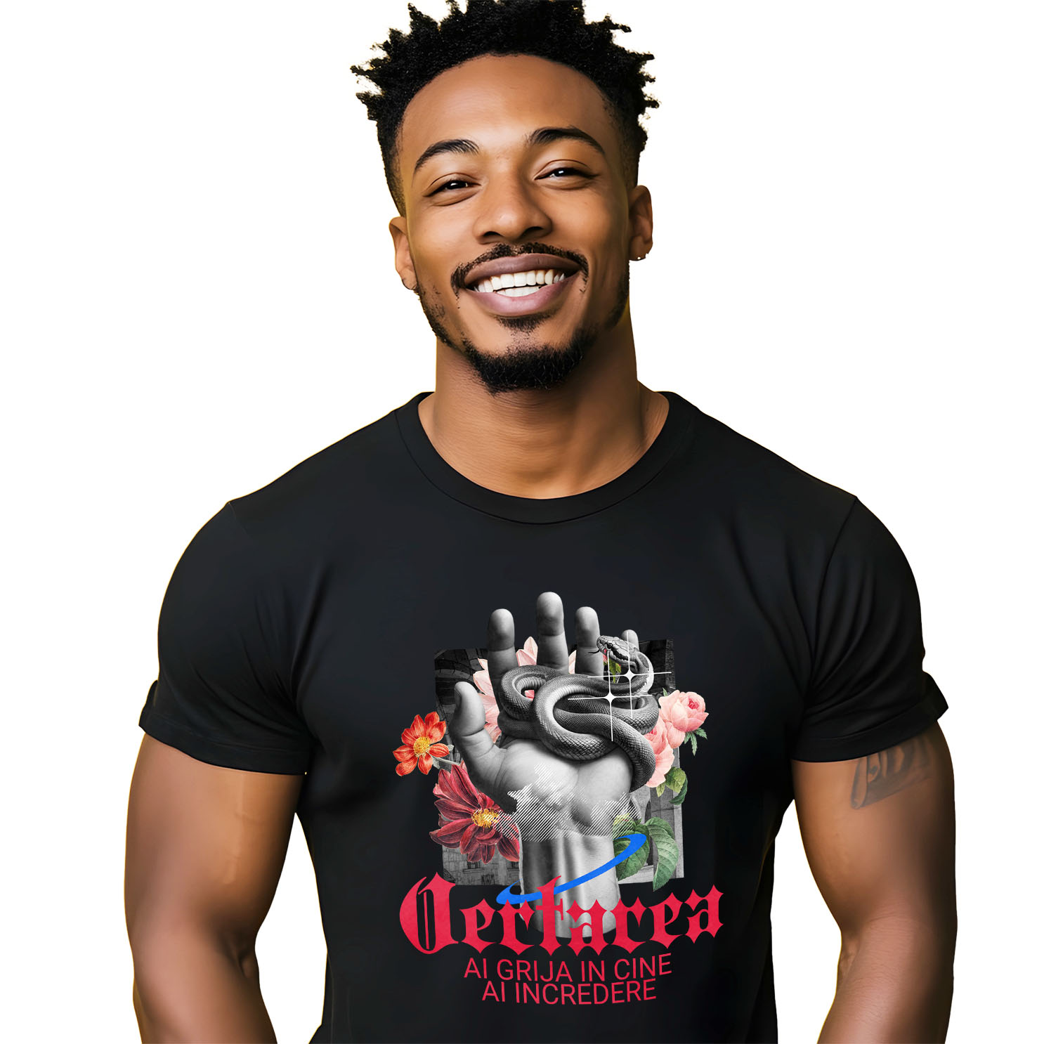 Tricou Barbati cu Mana Umana Sarpe Periculos Flori Colorate Plante Motivational cu imprimeu pe Fata, 100% Bumbac, Negru, L