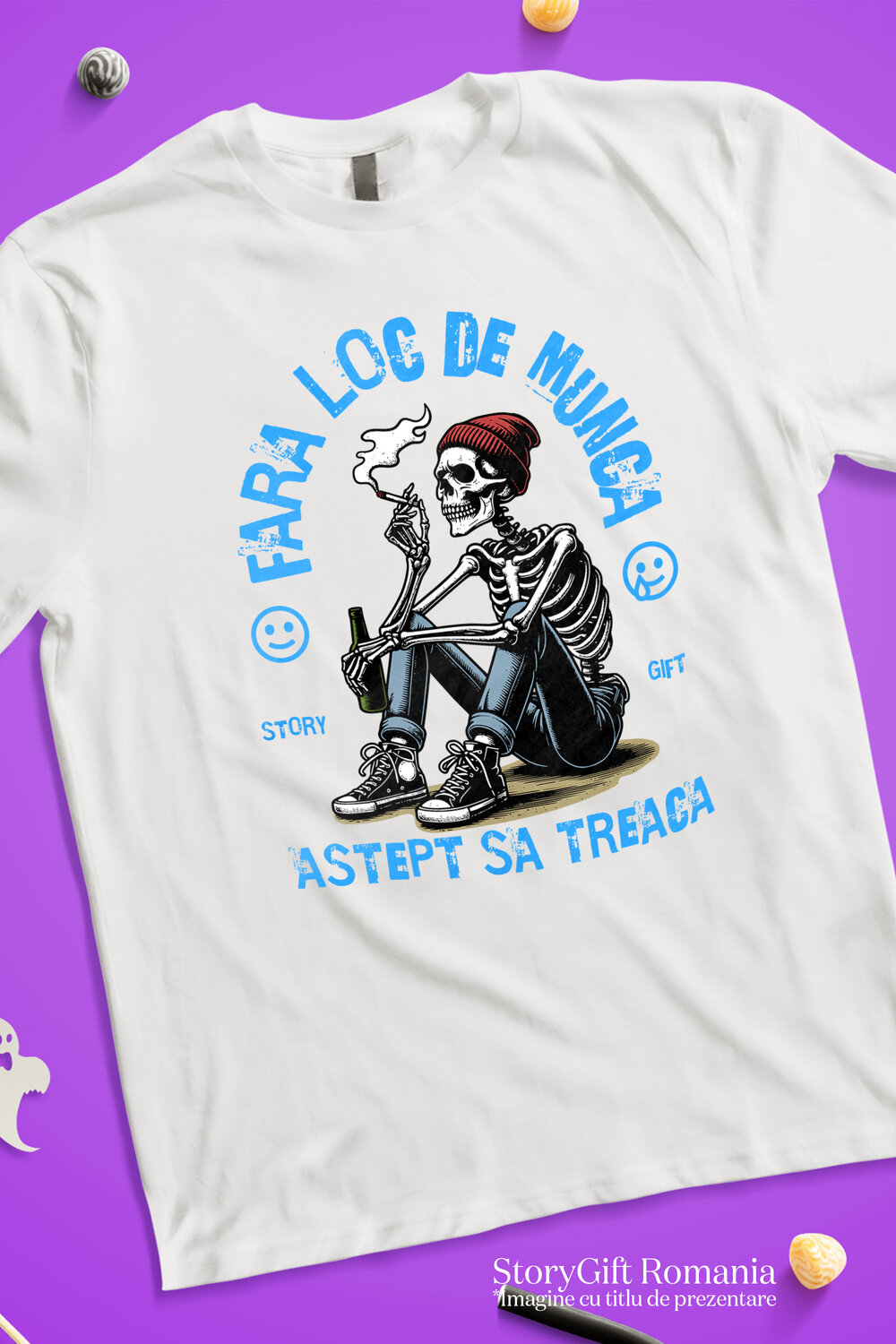 Tricou Barbati cu Schelete Uman Cu Tigara Si Bere Munca Oboseala Extenuare cu imprimeu pe Fata, 100% Bumbac, Alb, L
