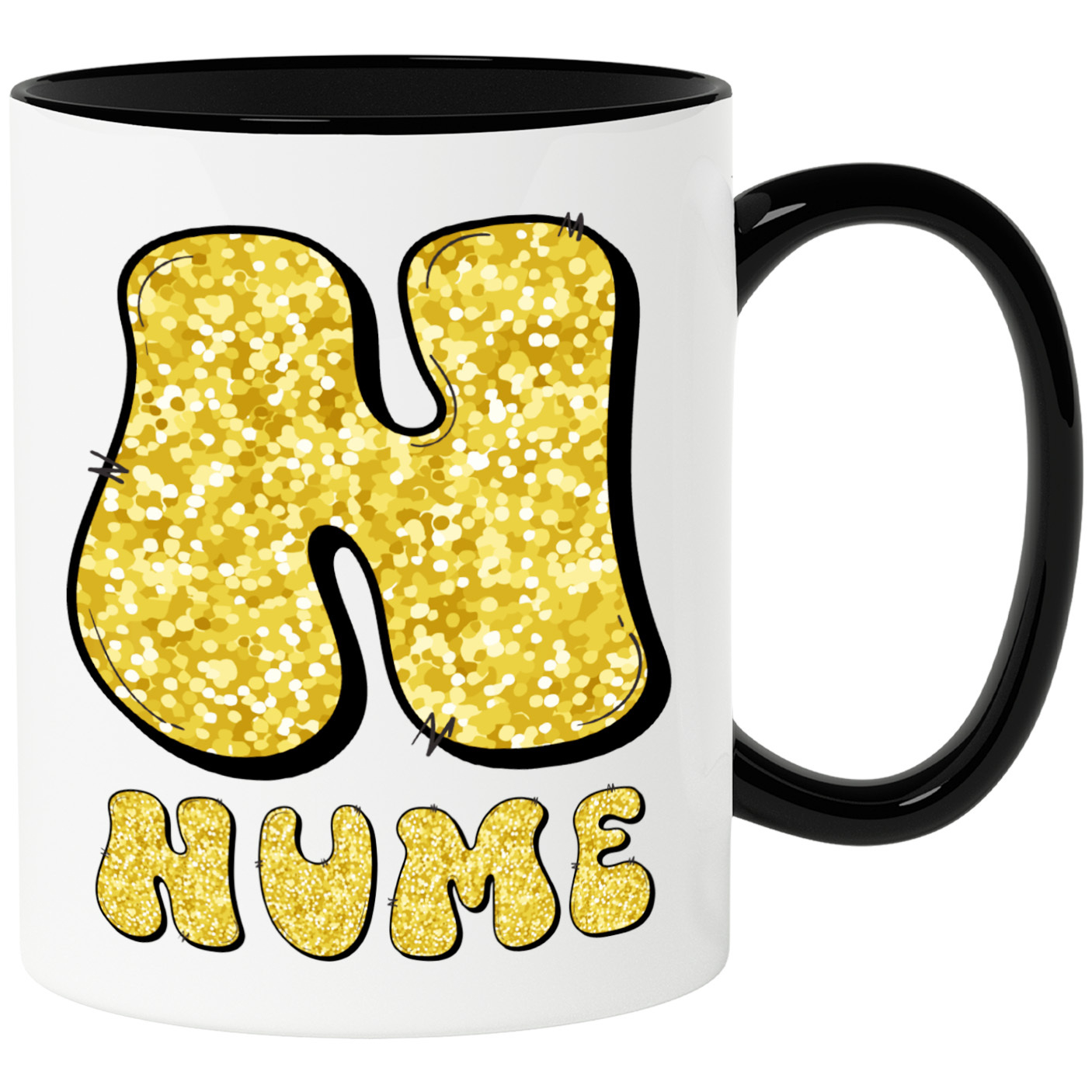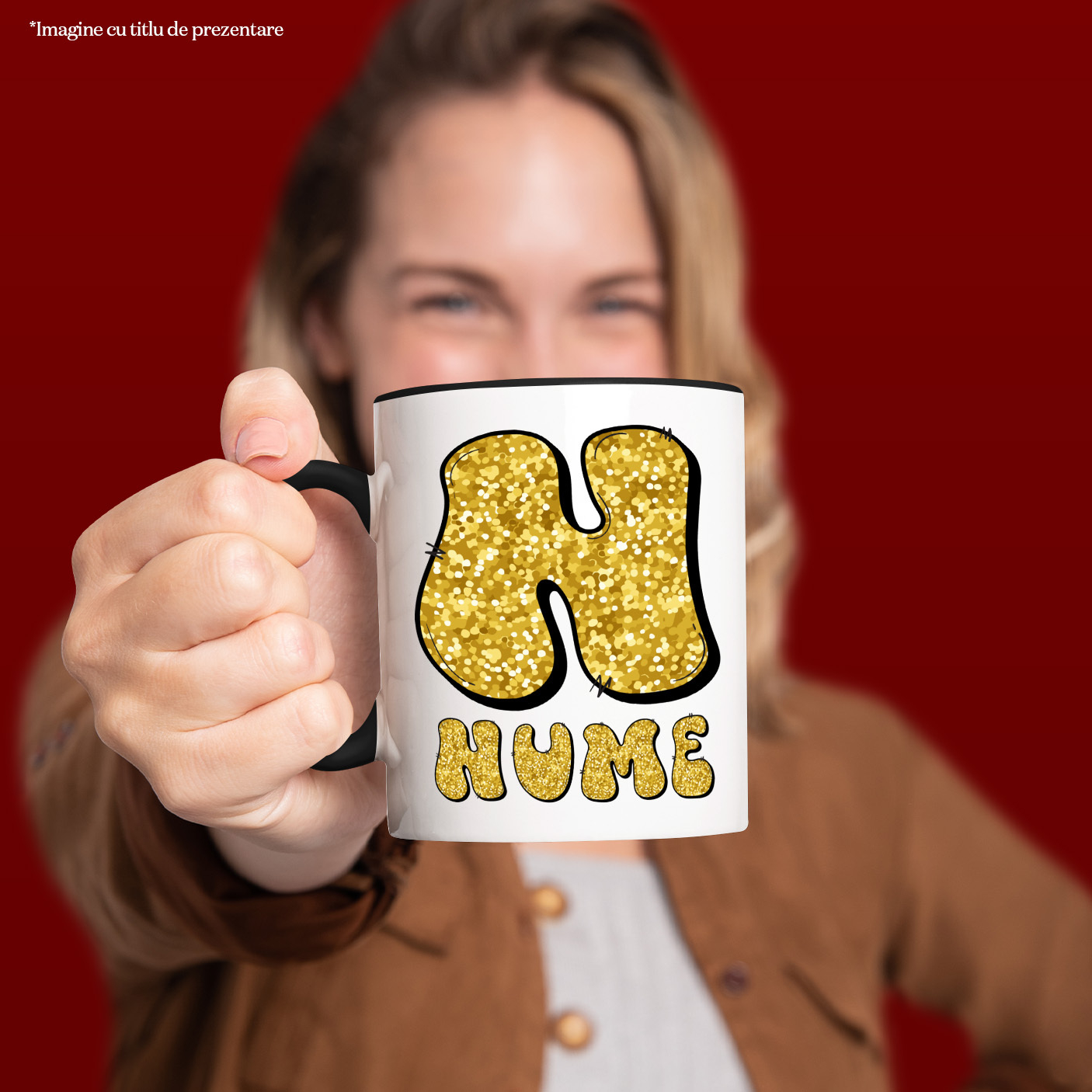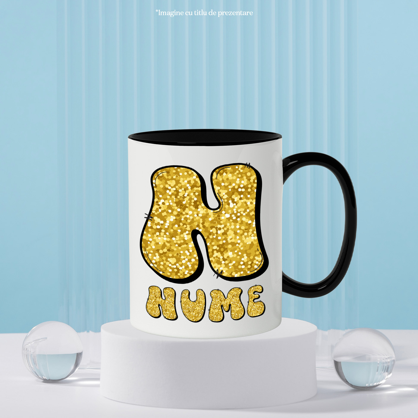 Cana Iubitorii De Sclipici, Text Nume Personalizat, Dragoste, Culoare galben, Cu Litera, 330ML, Ceramica, Cu Maner si Interior Negru