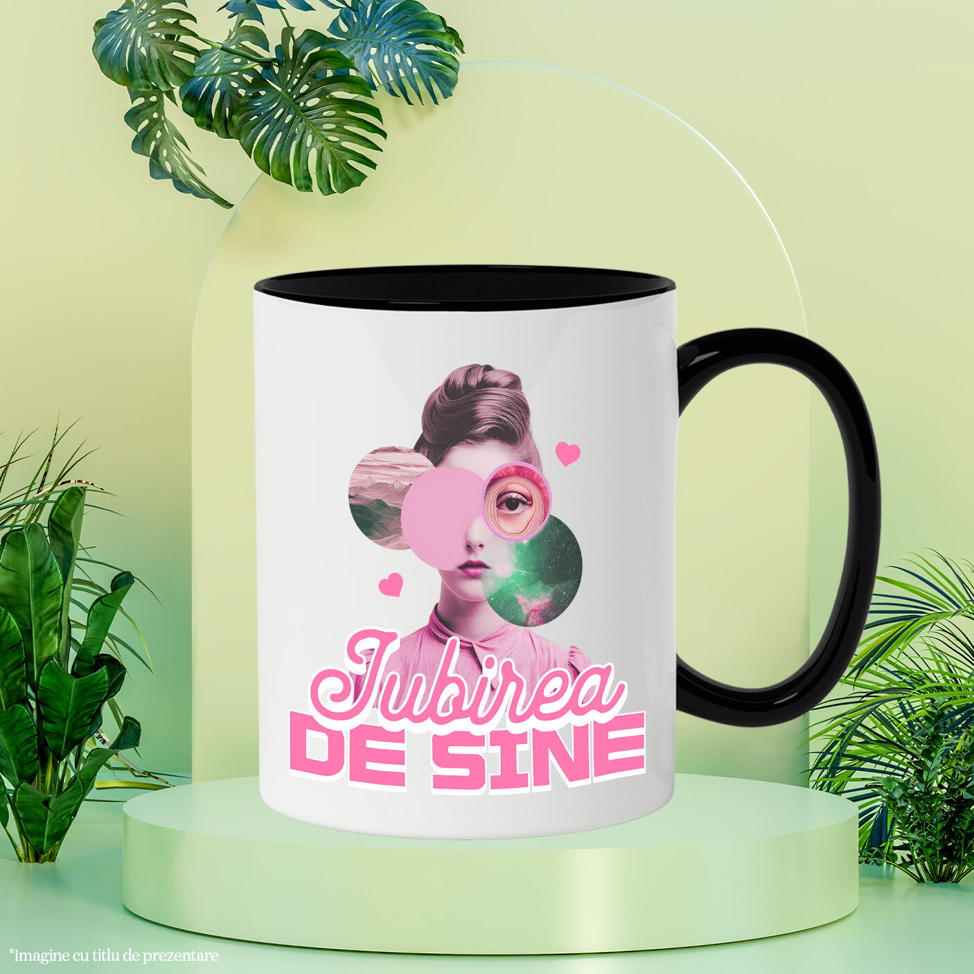 Cana Personalizata cu Chip Feminin Abstract Cu Lupa Ochii Camasa Roz Iubire De Sine Incredere Femeie, Ceramica, 330ML, cu Maner Negru