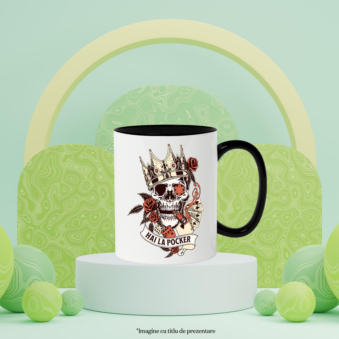 Cana Personalizata cu Craniu Uman Cu Coroana Regala Trabuc Trandafir Rosu Zaruri Carti De Joc, Ceramica, 330ML, cu Maner Negru
