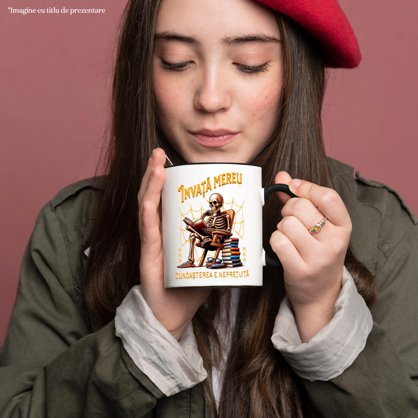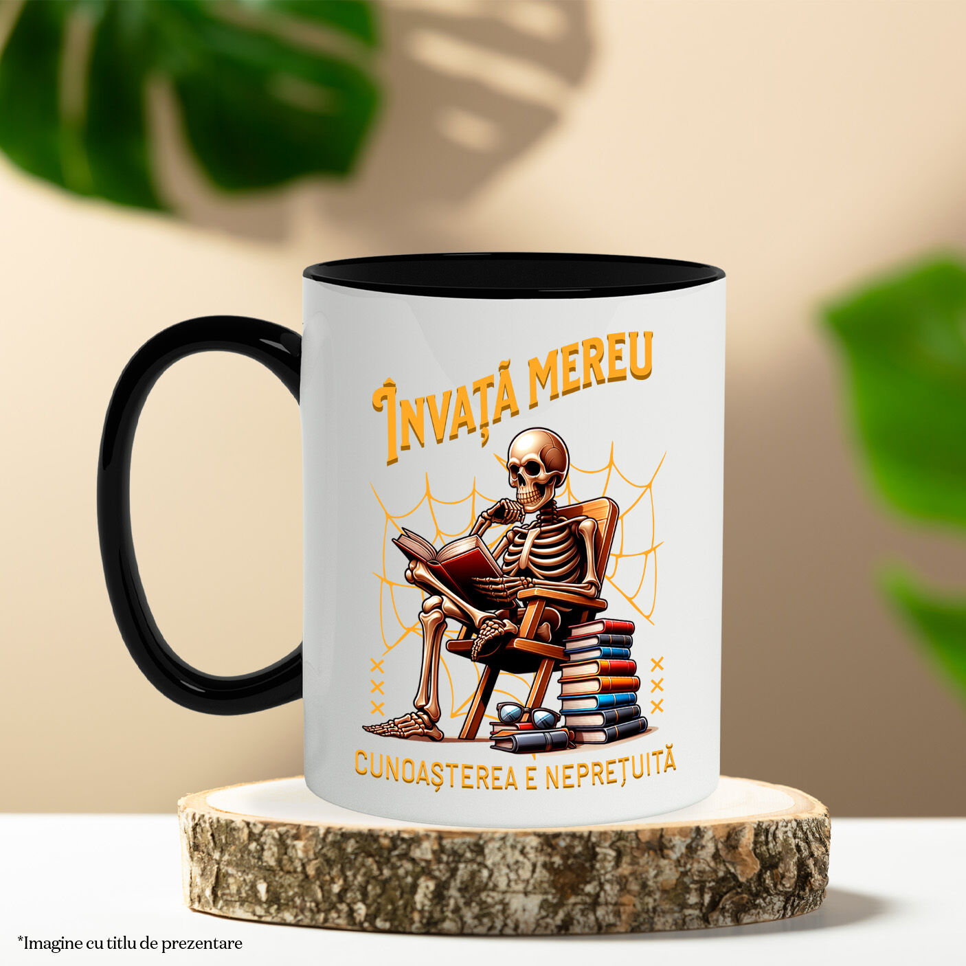Cana Personalizata cu Schelete Pe Fotoliu Cu Carte Citind, Teanc De Carti Invata Mereu Cunoastere, Ceramica, 330ML, cu Maner Negru