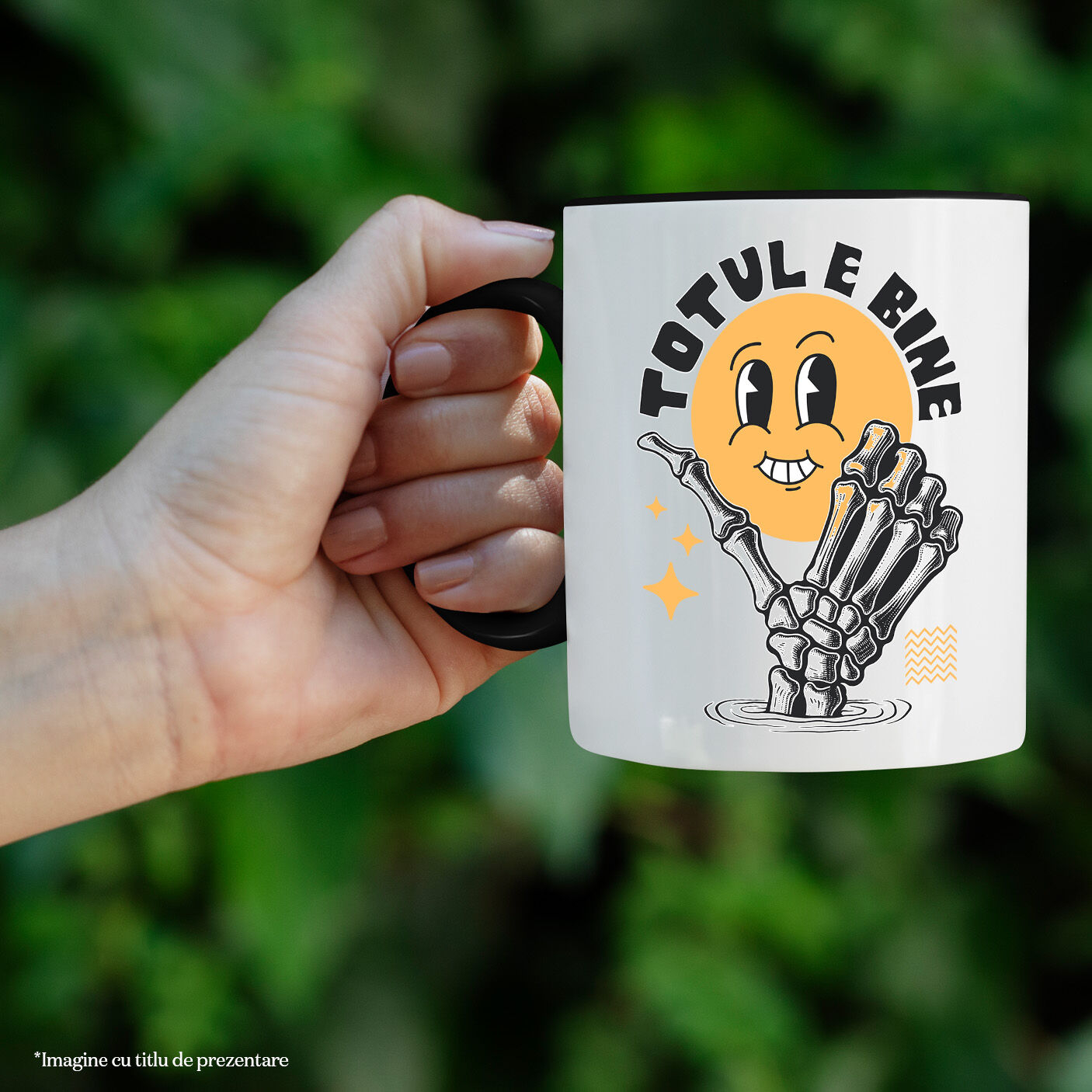 Cana Personalizata cu Smiley Face Vesel Mana Umana Schelete Mesaj Inspirational, Ceramica, 330ML, cu Maner Negru