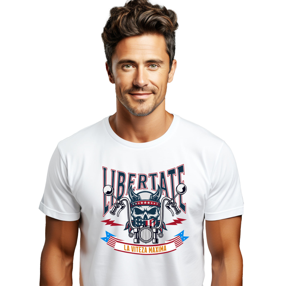 Tricou Barbati cu Craniu Uman Cu Coarne Si Bandana America Motocicleta Hobby Pasiune Viteza cu imprimeu pe Fata, 100% Bumbac, Alb, L