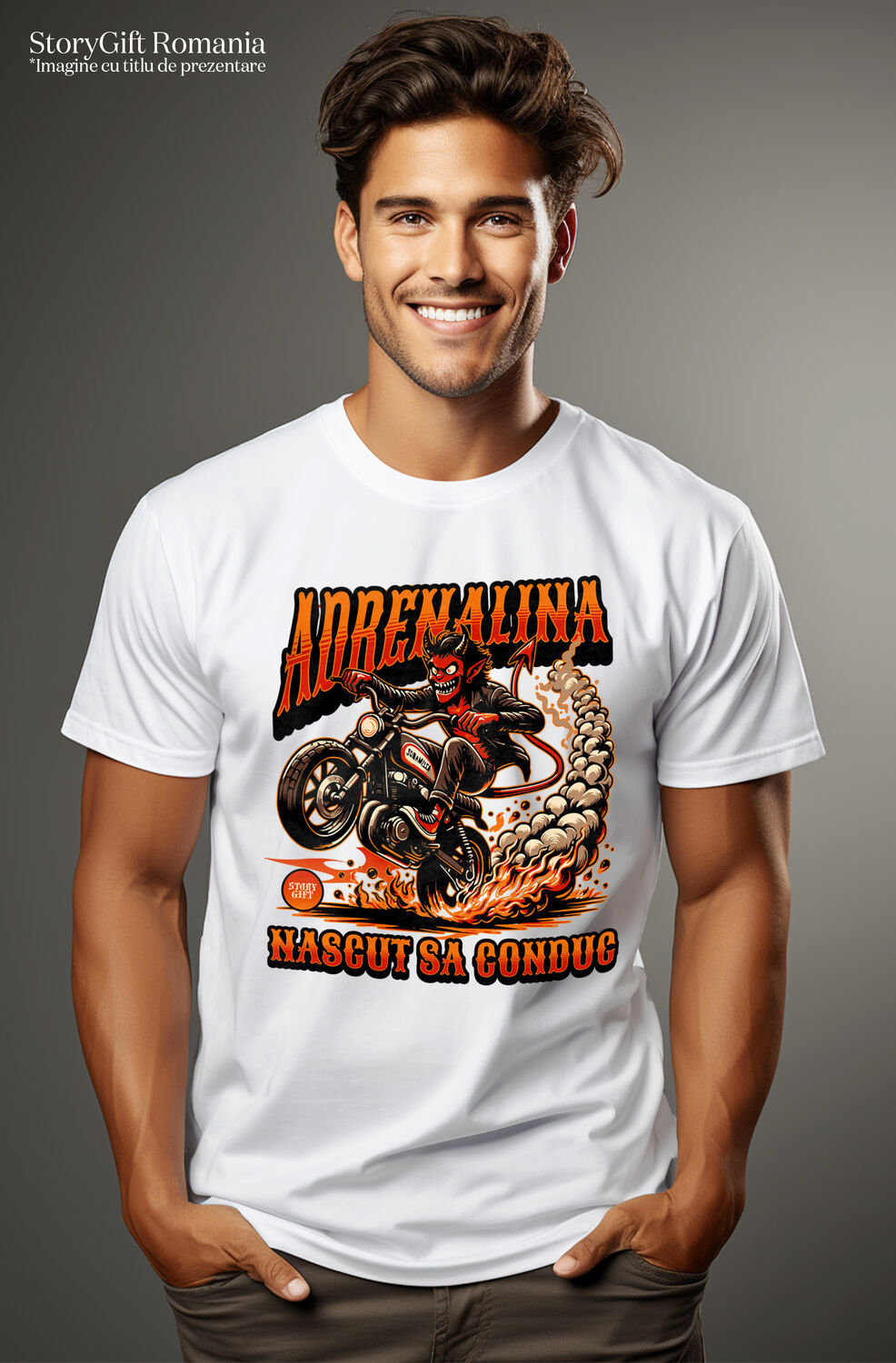 Tricou Barbati cu Diavol Cu Coarne Si Coada Pe Motocicleta Viteza Cursa Adrenalina cu imprimeu pe Fata, 100% Bumbac, Alb, M