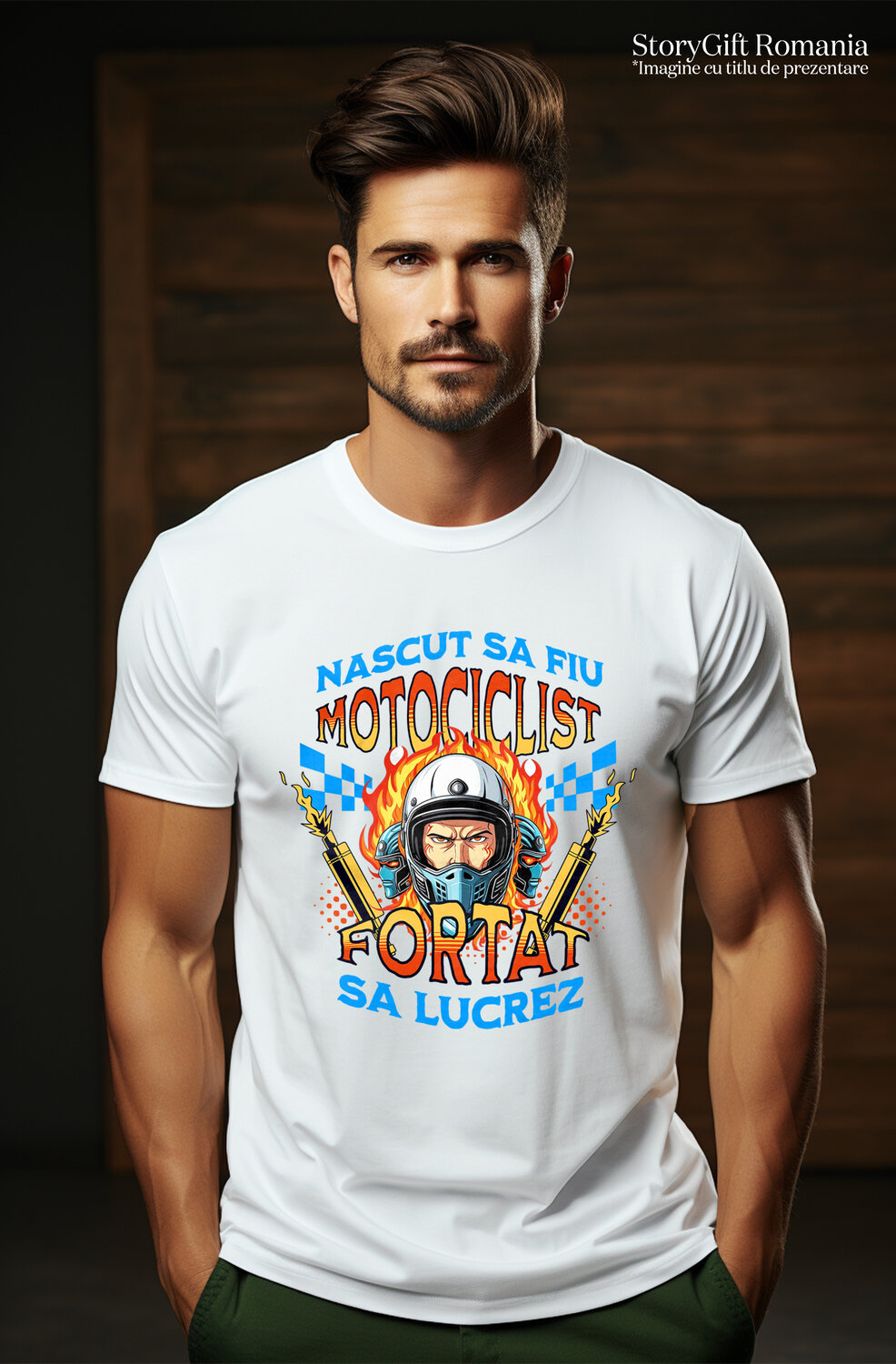Tricou Barbati cu Om Cu Casca Protectie Motor Tobe Esapament Flacari pasiune cu imprimeu pe Fata, 100% Bumbac, Alb, M