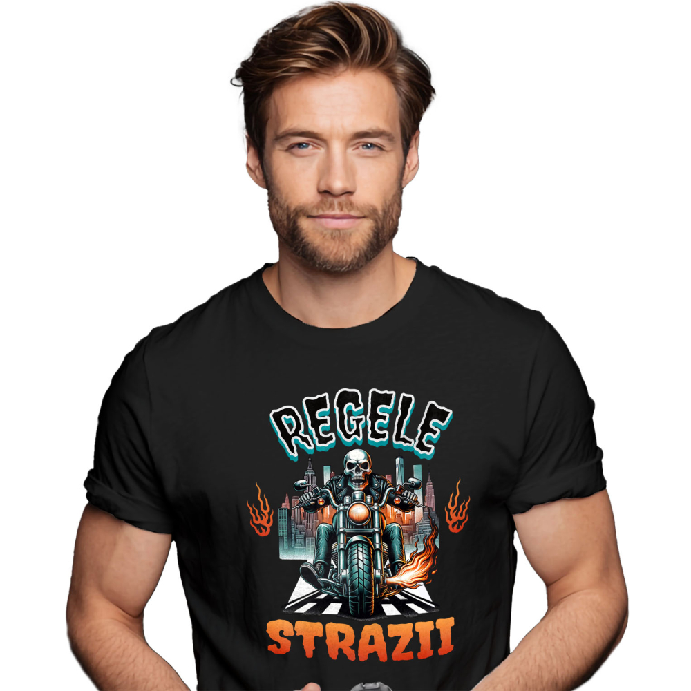 Tricou Barbati cu Schelete Uman Motociclist Cu Tinuta De Piele Flacari Oras Cu Cladiri Inalte cu imprimeu pe Fata, 100% Bumbac, Negru, L