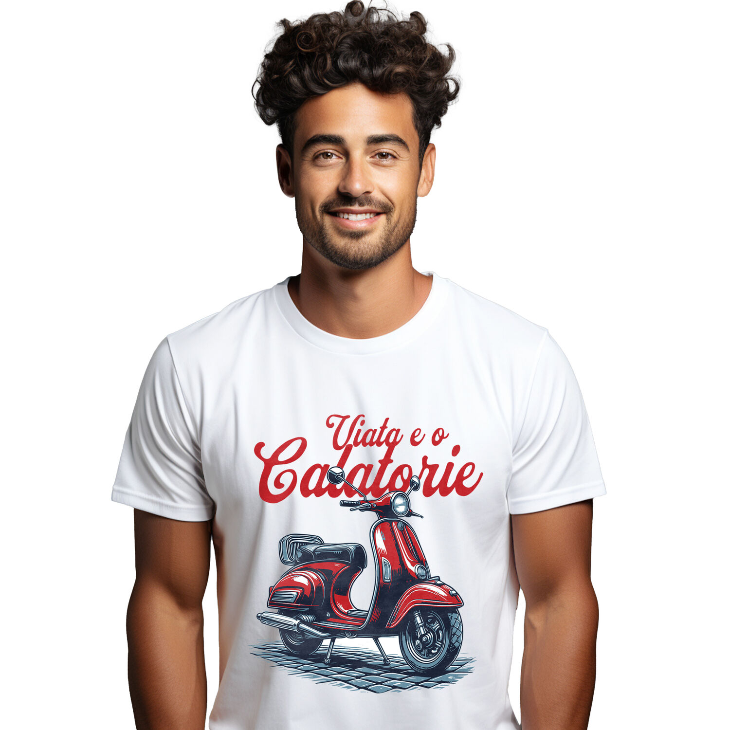 Tricou Barbati cu Scuter Rosu Clasic Plimbare Romantica Aventura Iubitorii De Calatorii cu imprimeu pe Fata, 100% Bumbac, Alb, XS